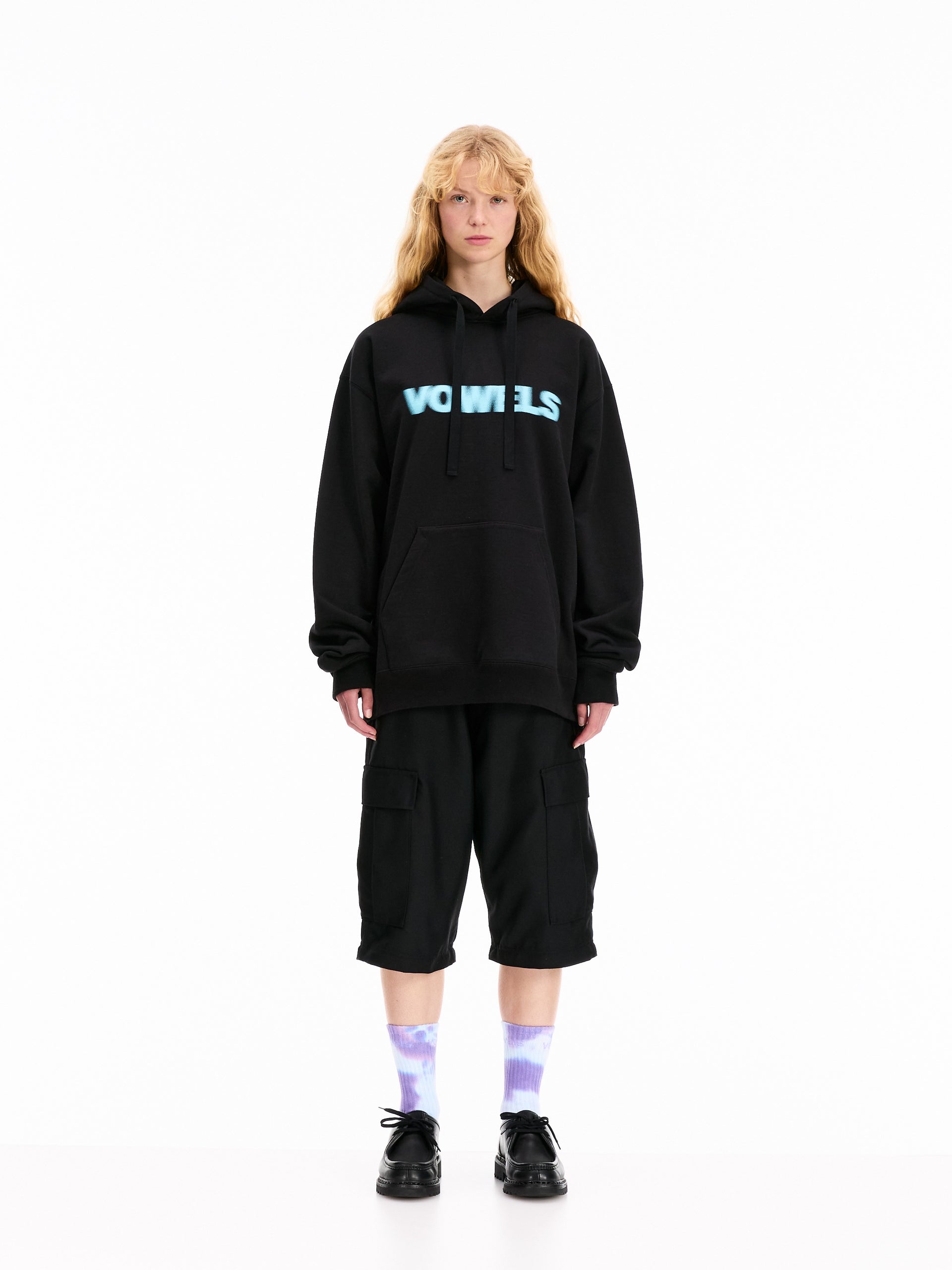 A vowels Classic Hoodie, featuring vowels wordmark screenprinted on chest, embroidered vowels logo on left sleeve, flat drawcords, and v-shaped panel reinforcement on hood and neck line seams.