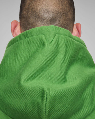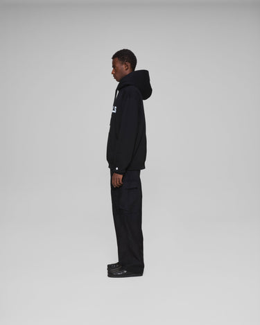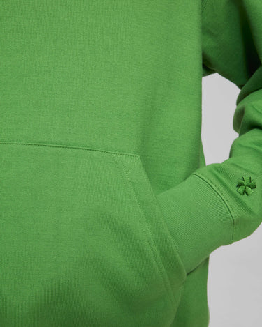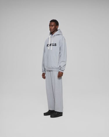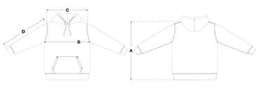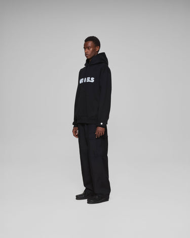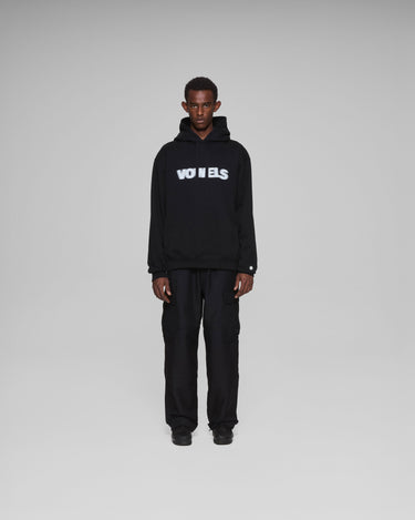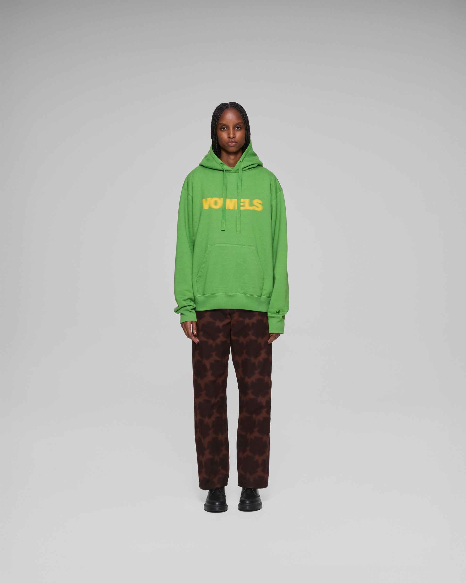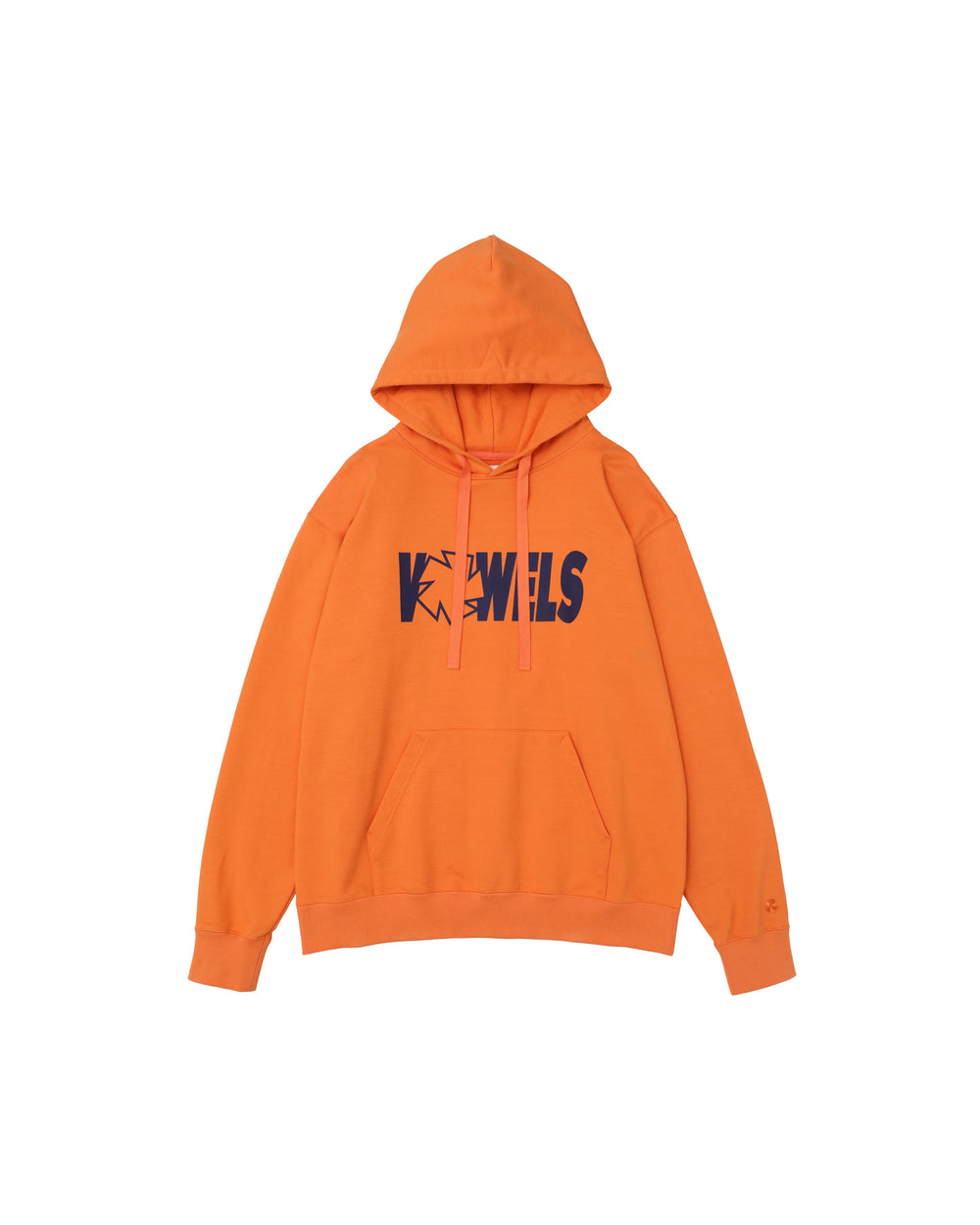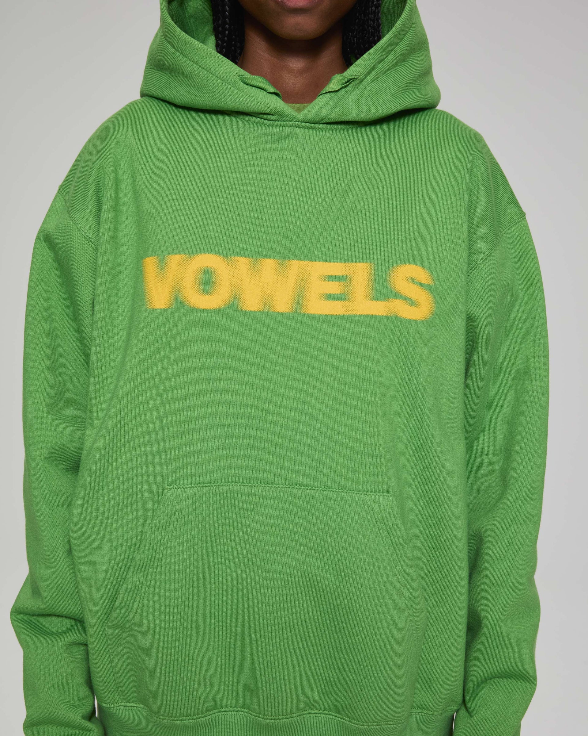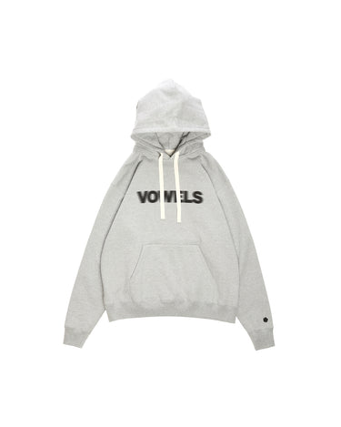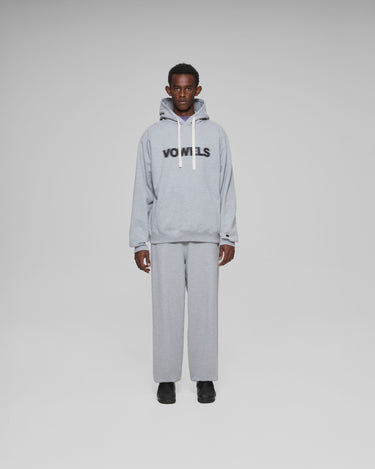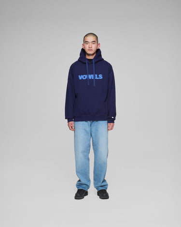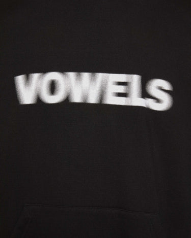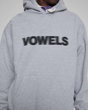 A vowels Classic Hoodie, featuring vowels wordmark screenprinted on chest, embroidered vowels logo on left sleeve, flat drawcords, and v-shaped panel reinforcement on hood and neck line seams.