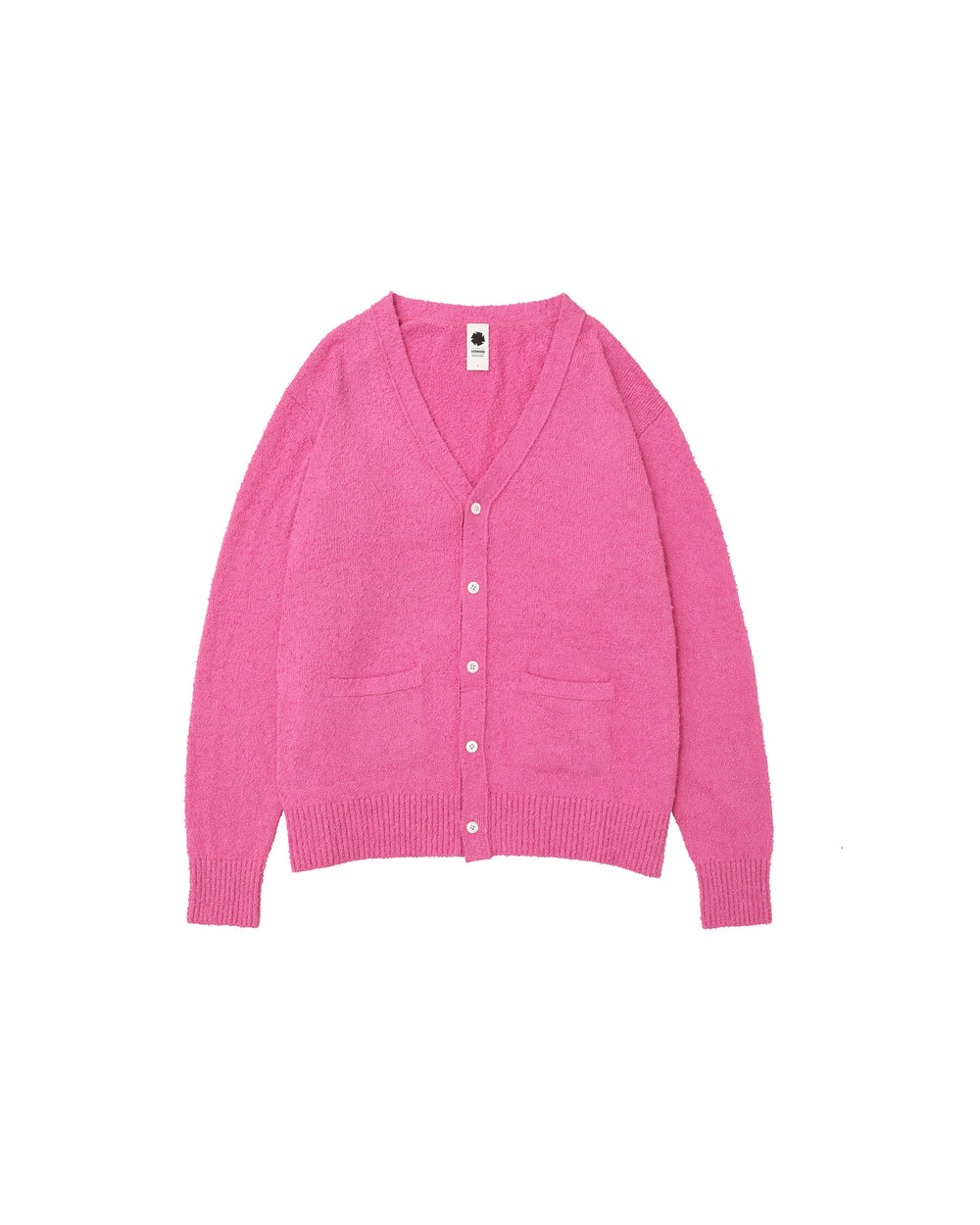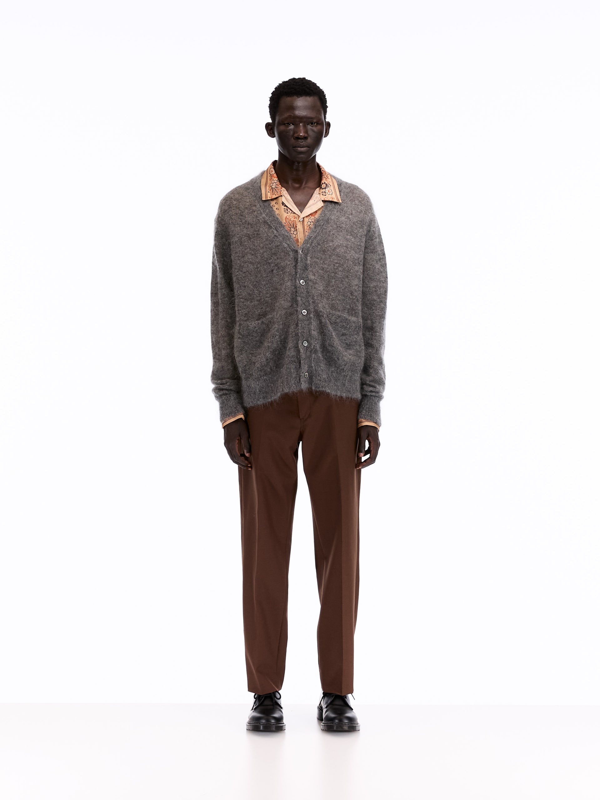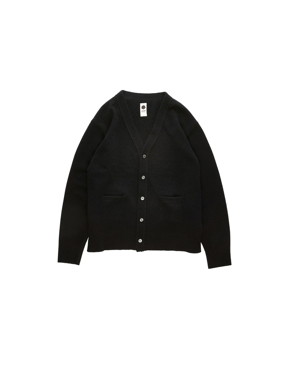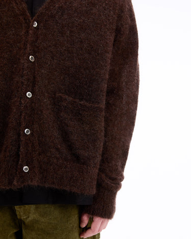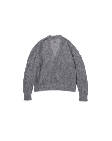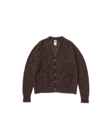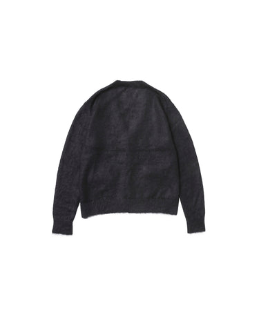 A knit cardigan made from extrafine kid mohair, with fur processing applied during production to add loft and resistance.