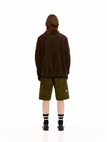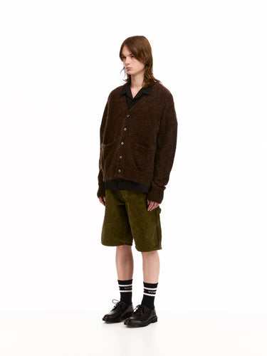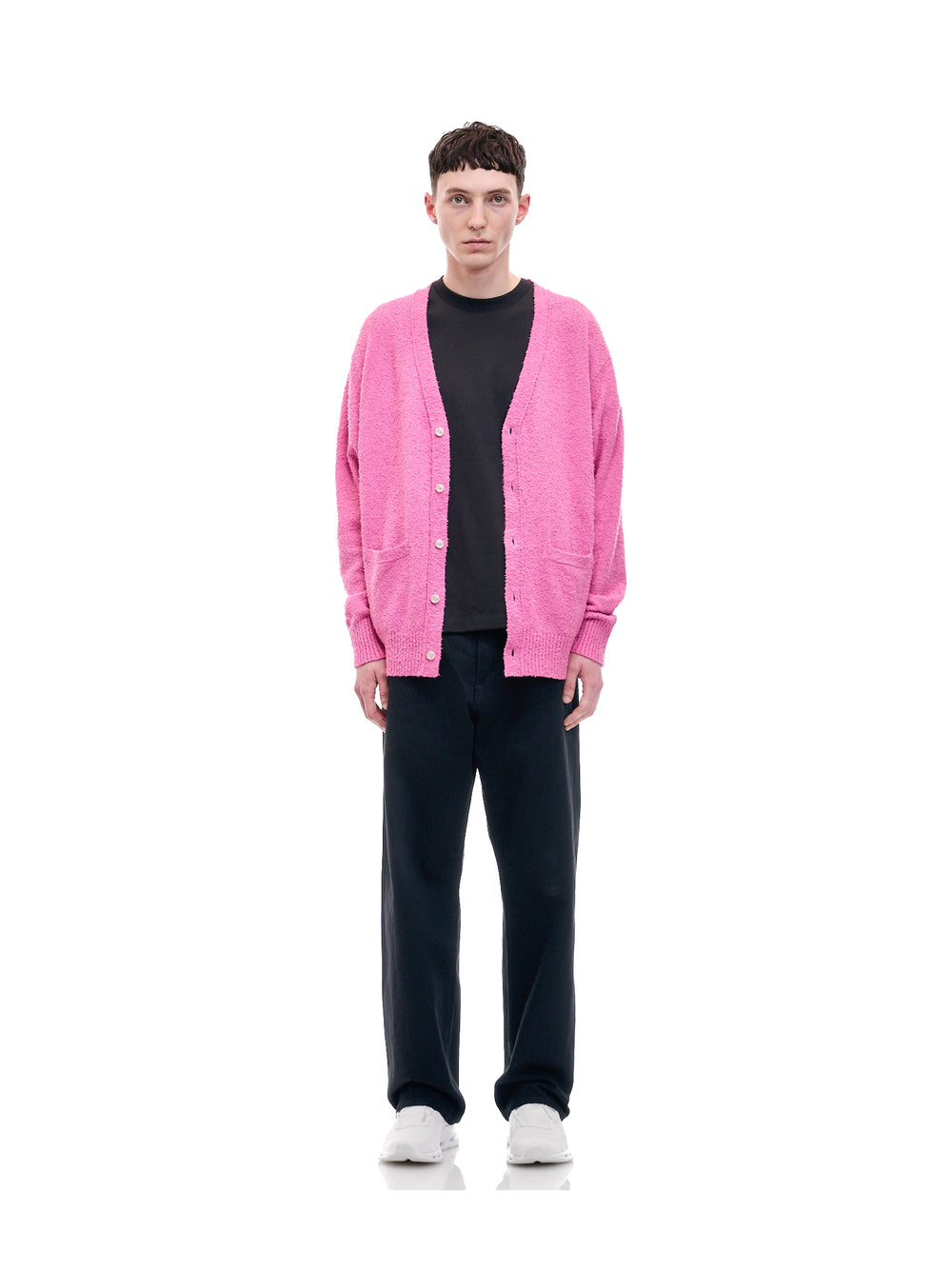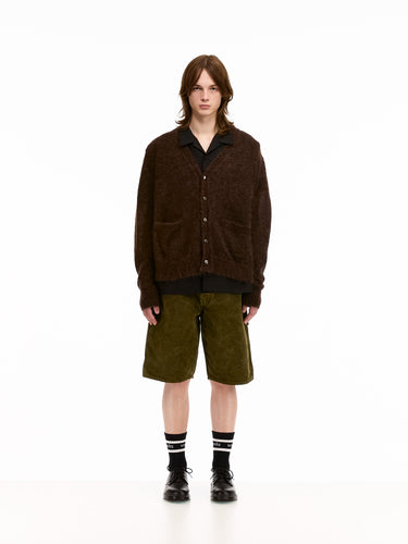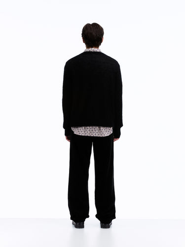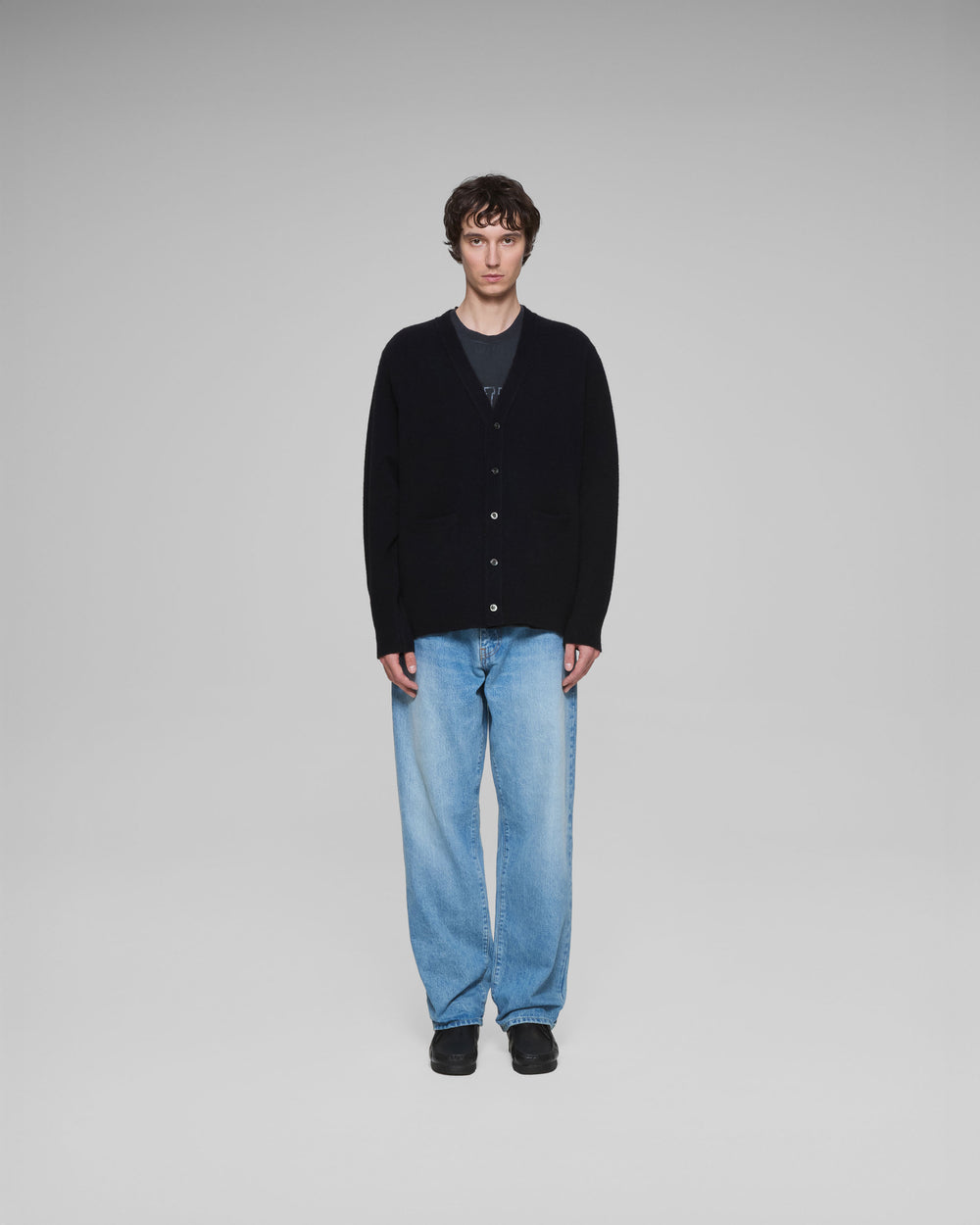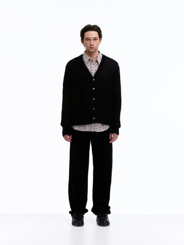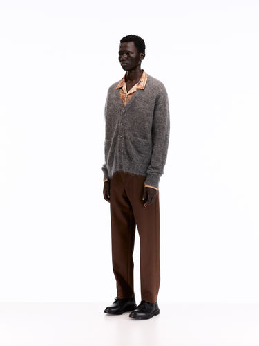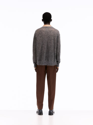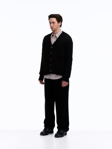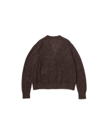 A knit cardigan made from extrafine kid mohair, with fur processing applied during production to add loft and resistance.