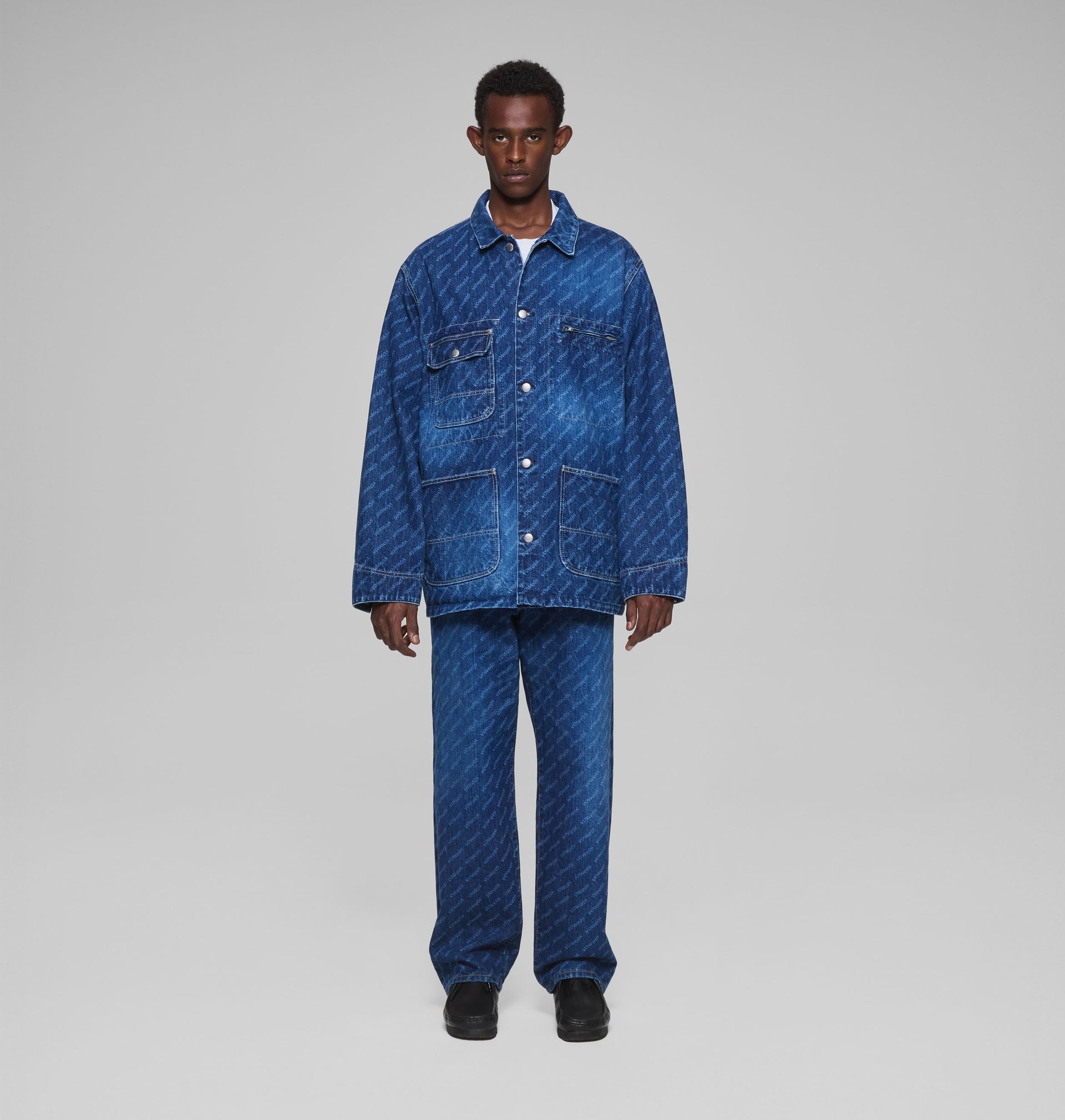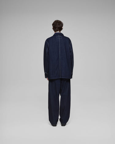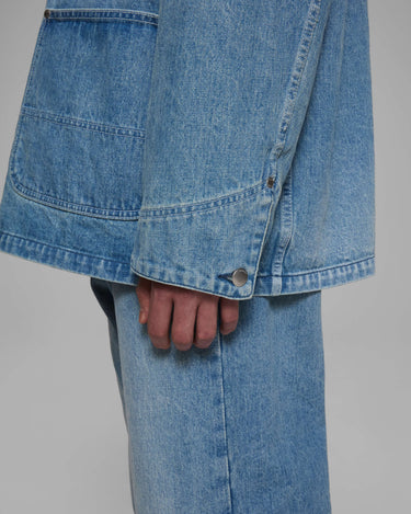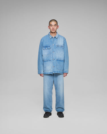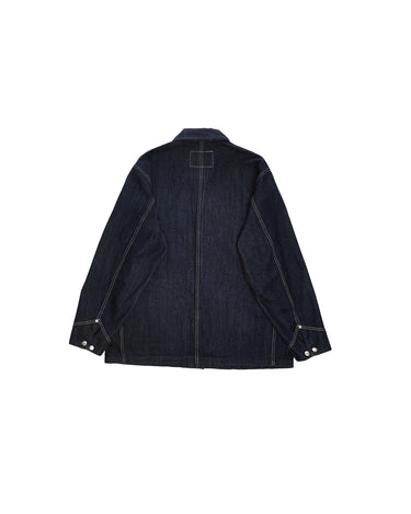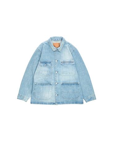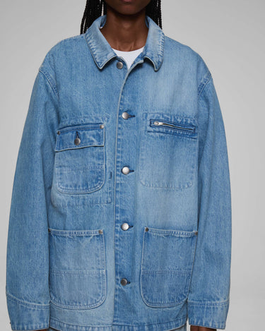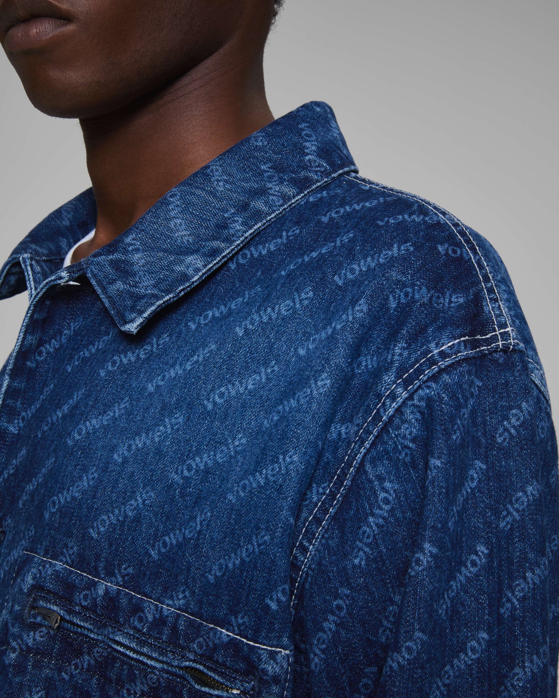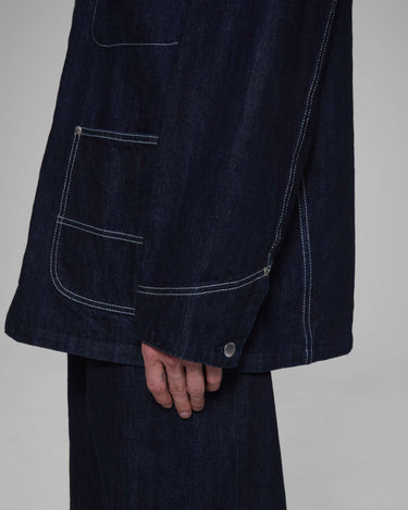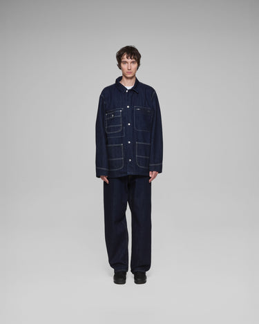 Selvedge denim jacket inspired by the classic French chore coat. Featuring custom logo embossed jeans buttons, "V" detail at sleeve closure, and vowels logo patch. Multiple exterior pockets including one zippered pocket, as well as one interior drop pocket.