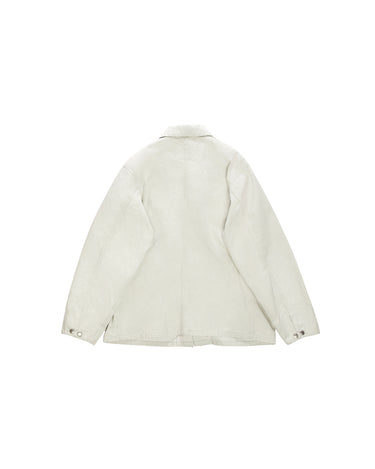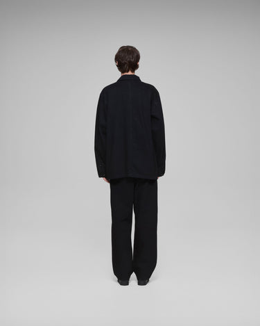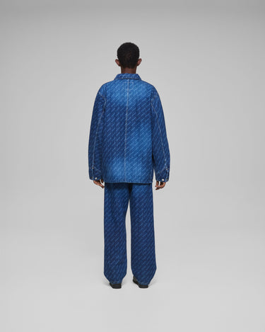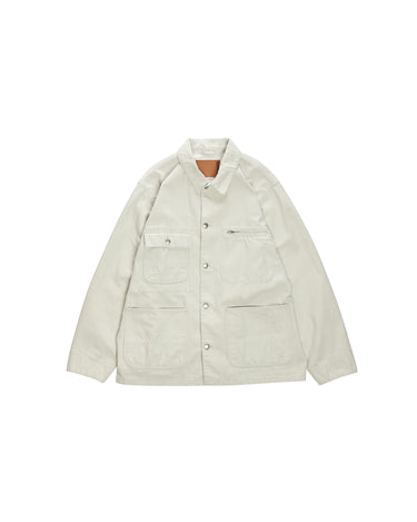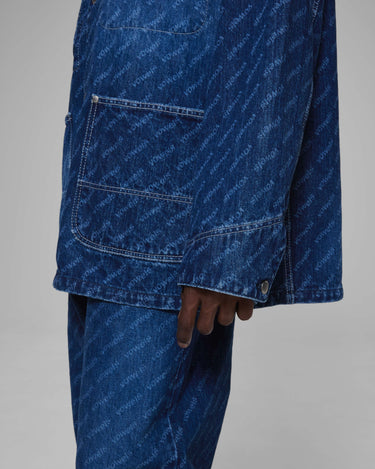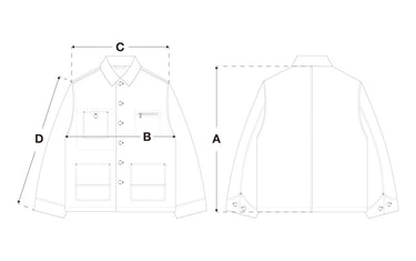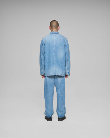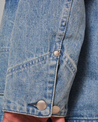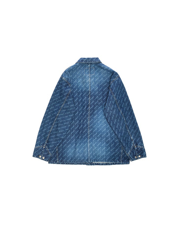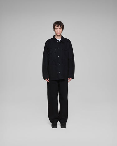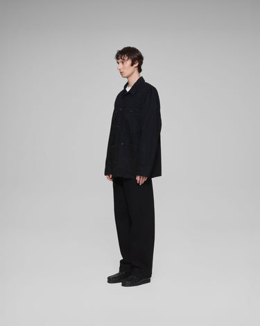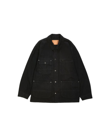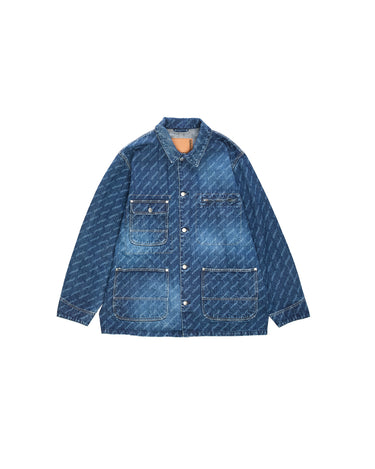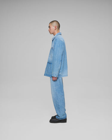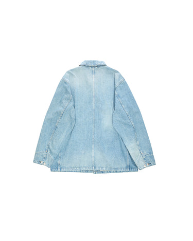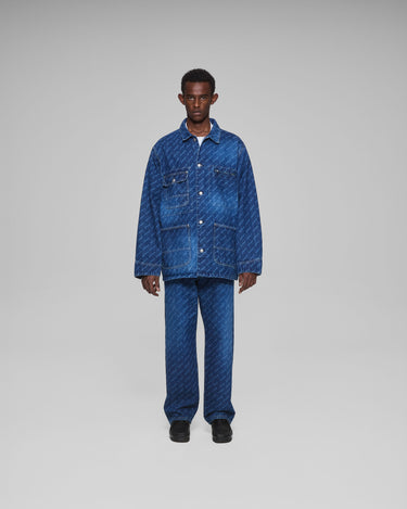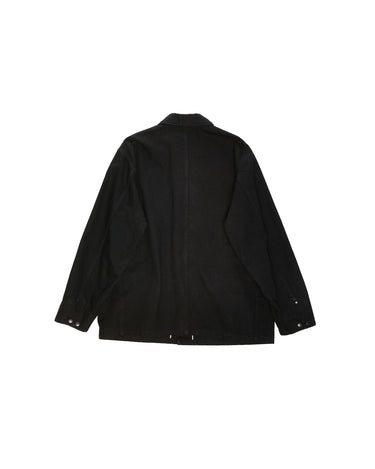 Selvedge denim jacket inspired by the classic French chore coat. Featuring custom logo embossed jeans buttons, "V" detail at sleeve closure, and vowels logo patch. Multiple exterior pockets including one zippered pocket, as well as one interior drop pocket.