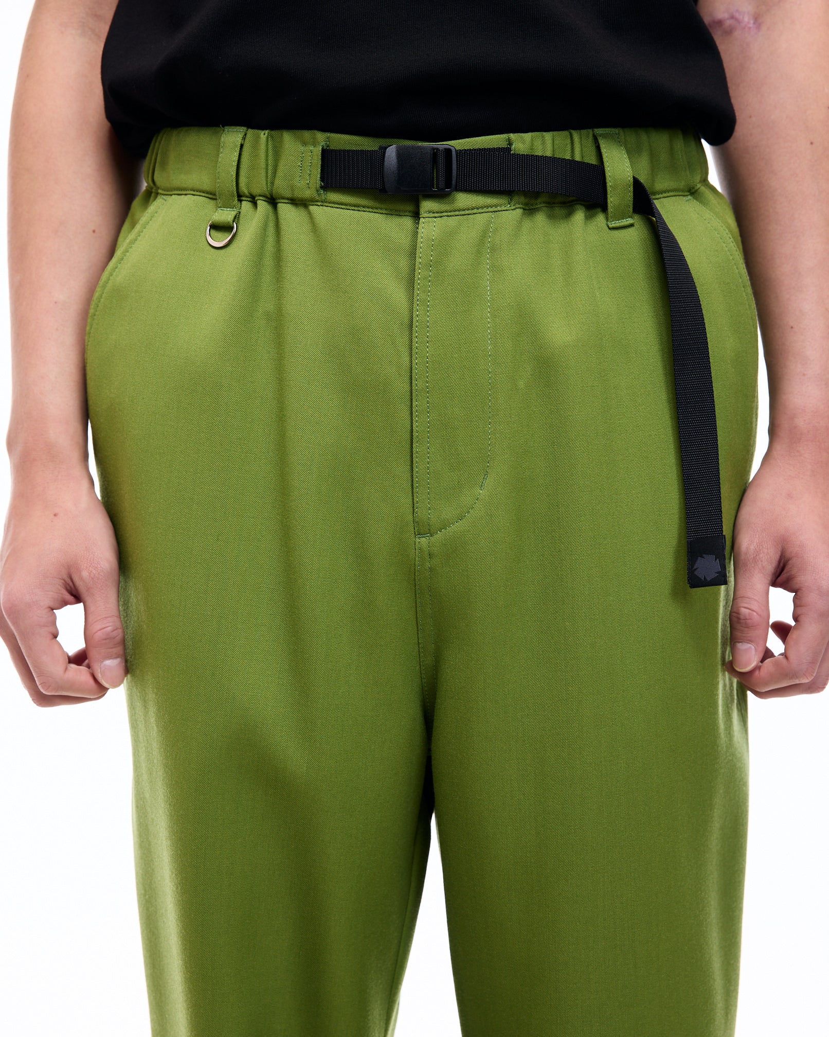 Easy wearing wool pants, with a finishing process to add elasticity and durability, with an included built in belt closure.