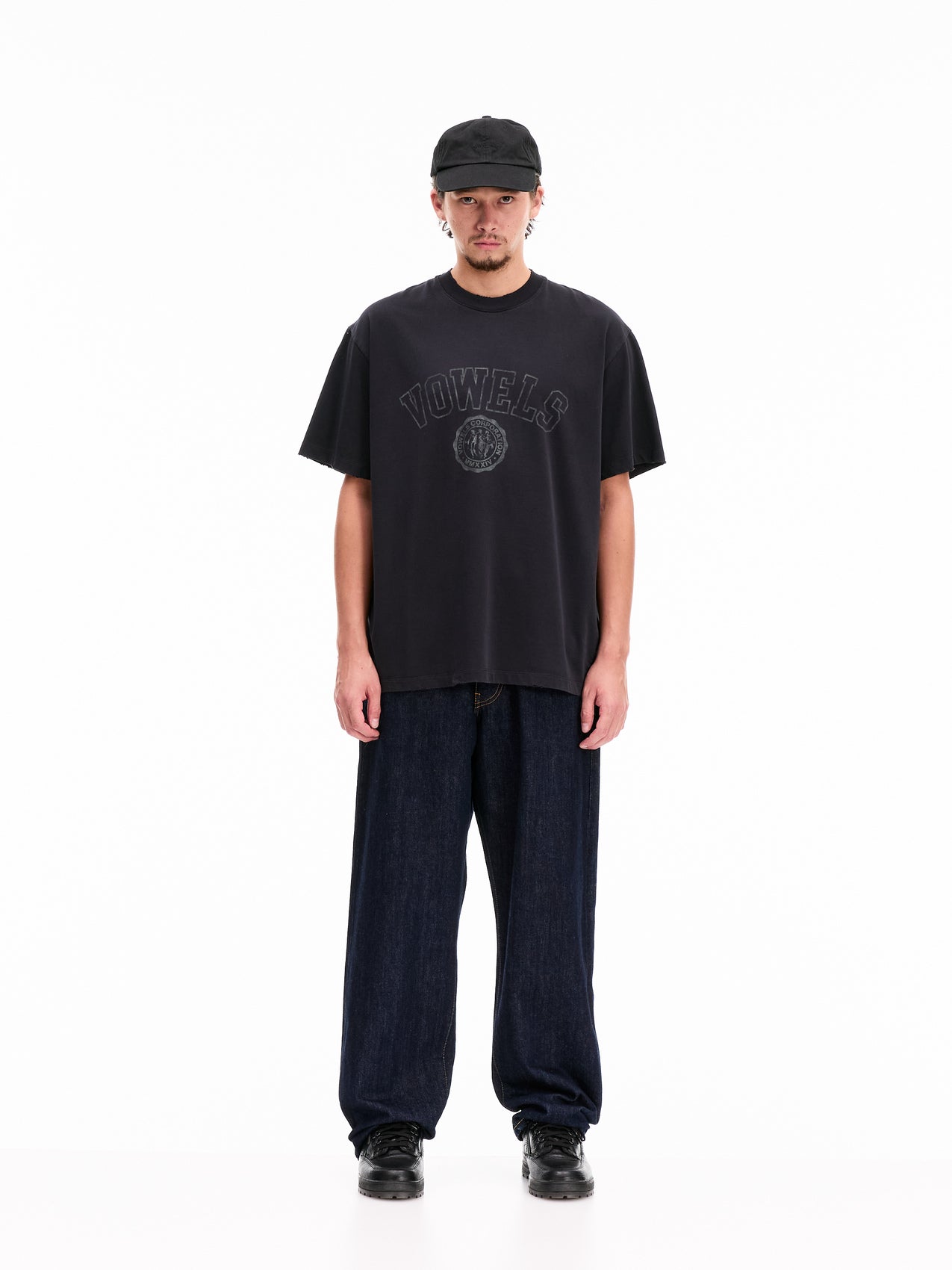 Our box fit classic tee, garment dyed and treated for a vintage wash and appearance. Features a collegiate inspired graphic printed on the front, creating a durable and sturdy tee shirt with a timeless feel.
