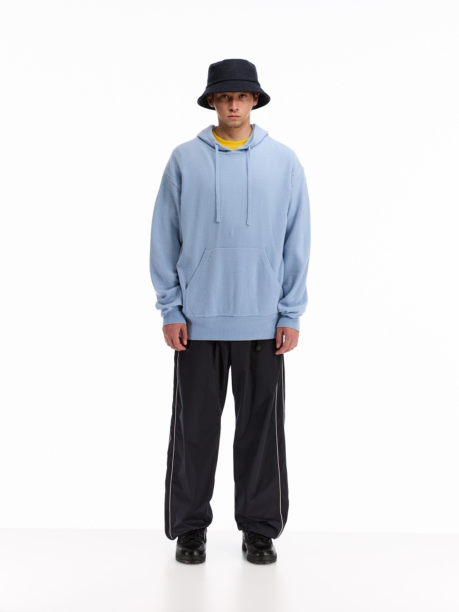 A knit hooded sweatshirt, with a relaxed fit, featuring ultra-fine fibers similar to cashmere.