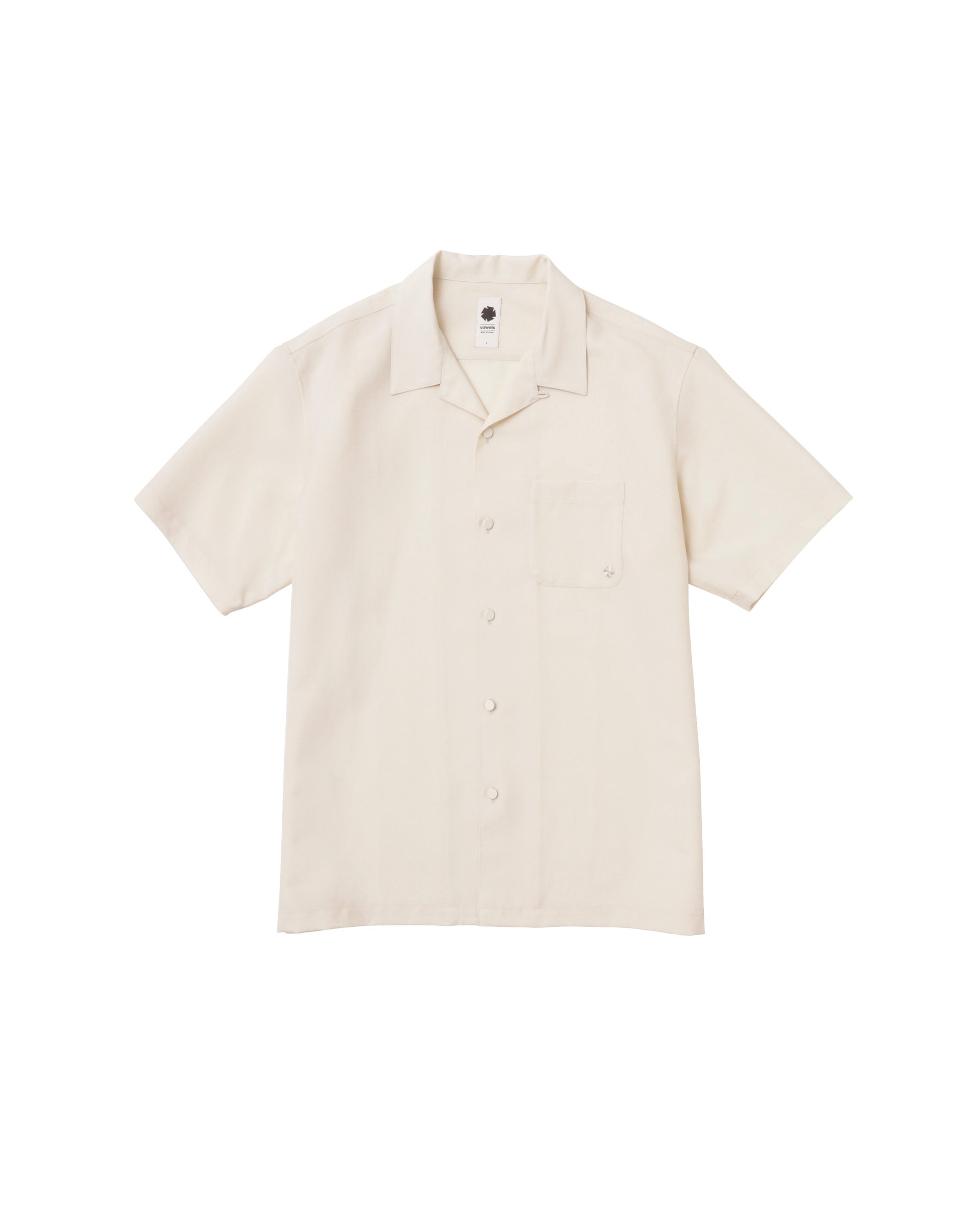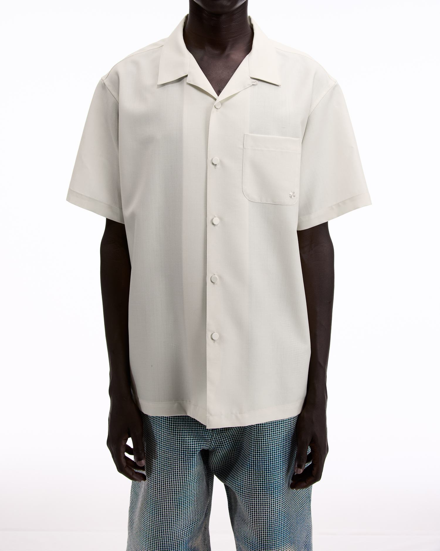 An open-collar wool-mohair shirt, with a sturdy handfeel and high-quality sheen.