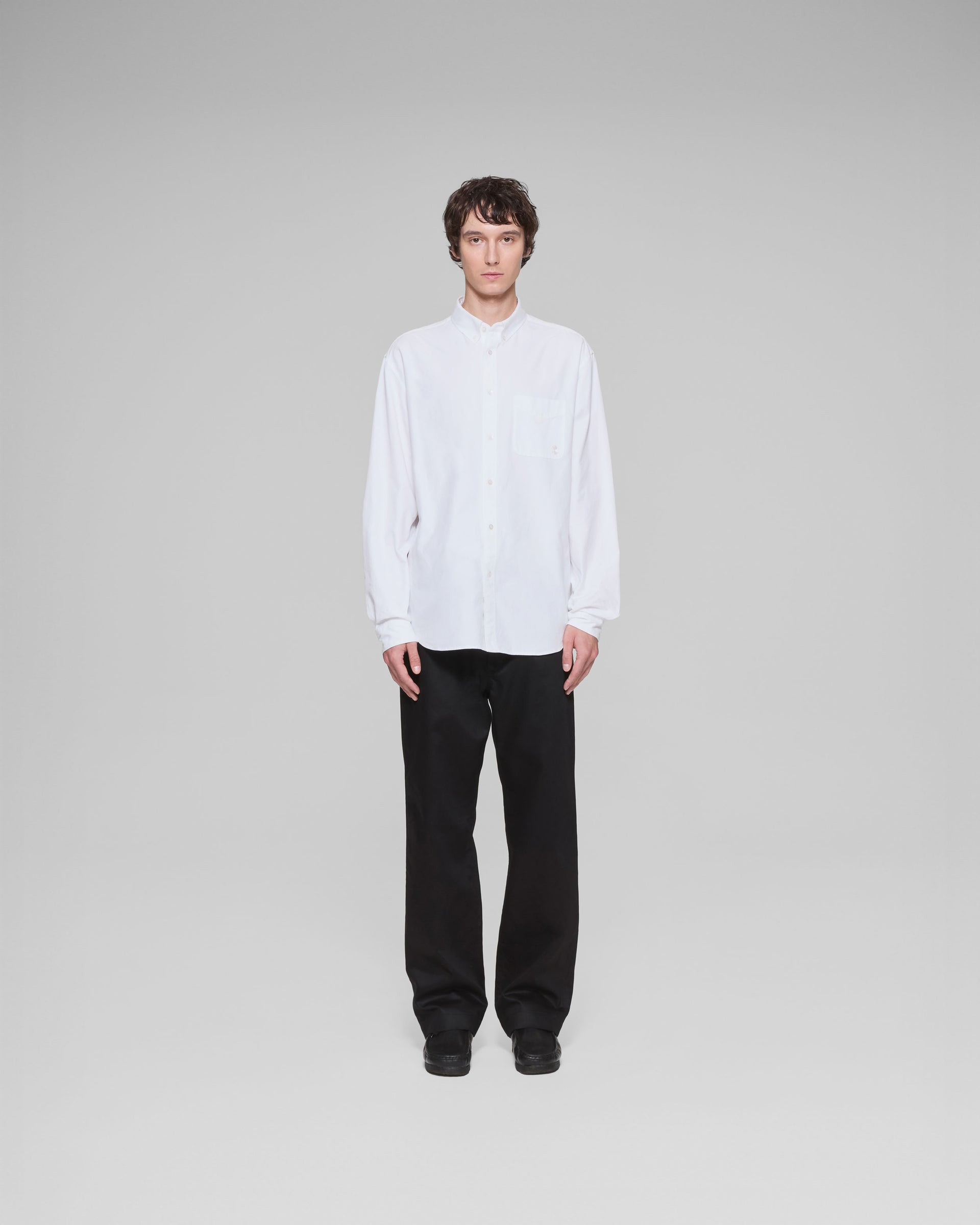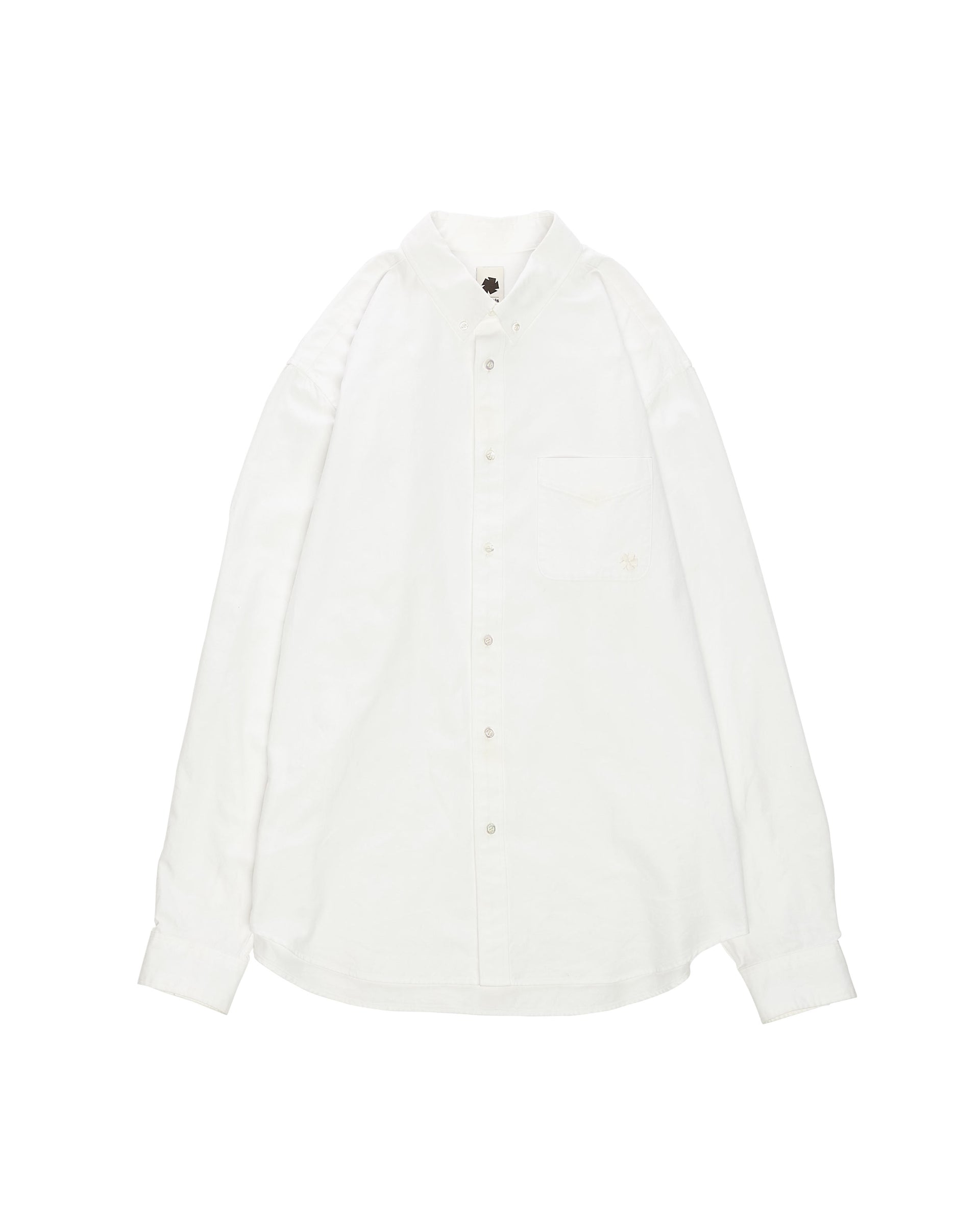 Oxford Cloth button down shirt. Featuring color-matched embroidered logo on chest pocket and custom mother of pearl buttons. Cut for a roomy fit. Available in two colors featuring a glossy finish for minimal pilling.
