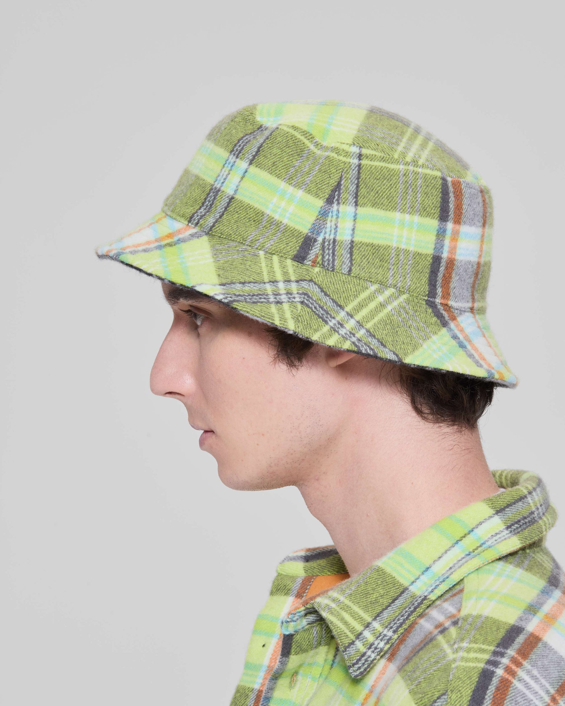 Two way reversible cashmere-wool bucket hat, featuring original contrasting check patterns. Featuring eyelets on both sides, stitched brim, and brand logo tab on left side.