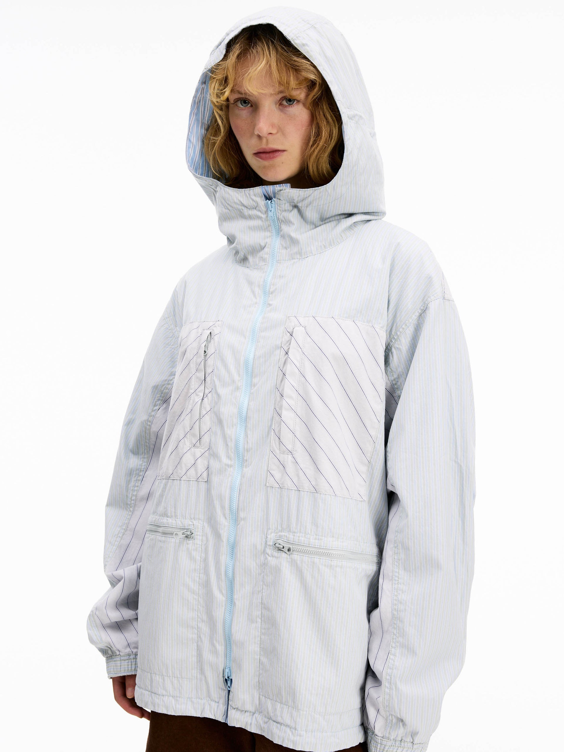 A reversible shell jacket made from densely woven shirting fabric.