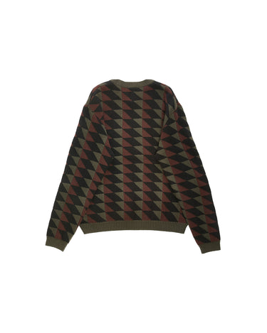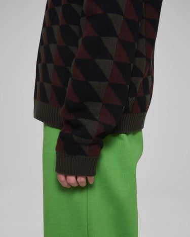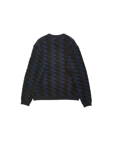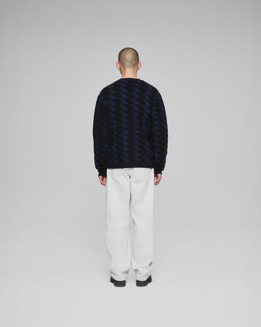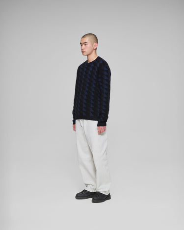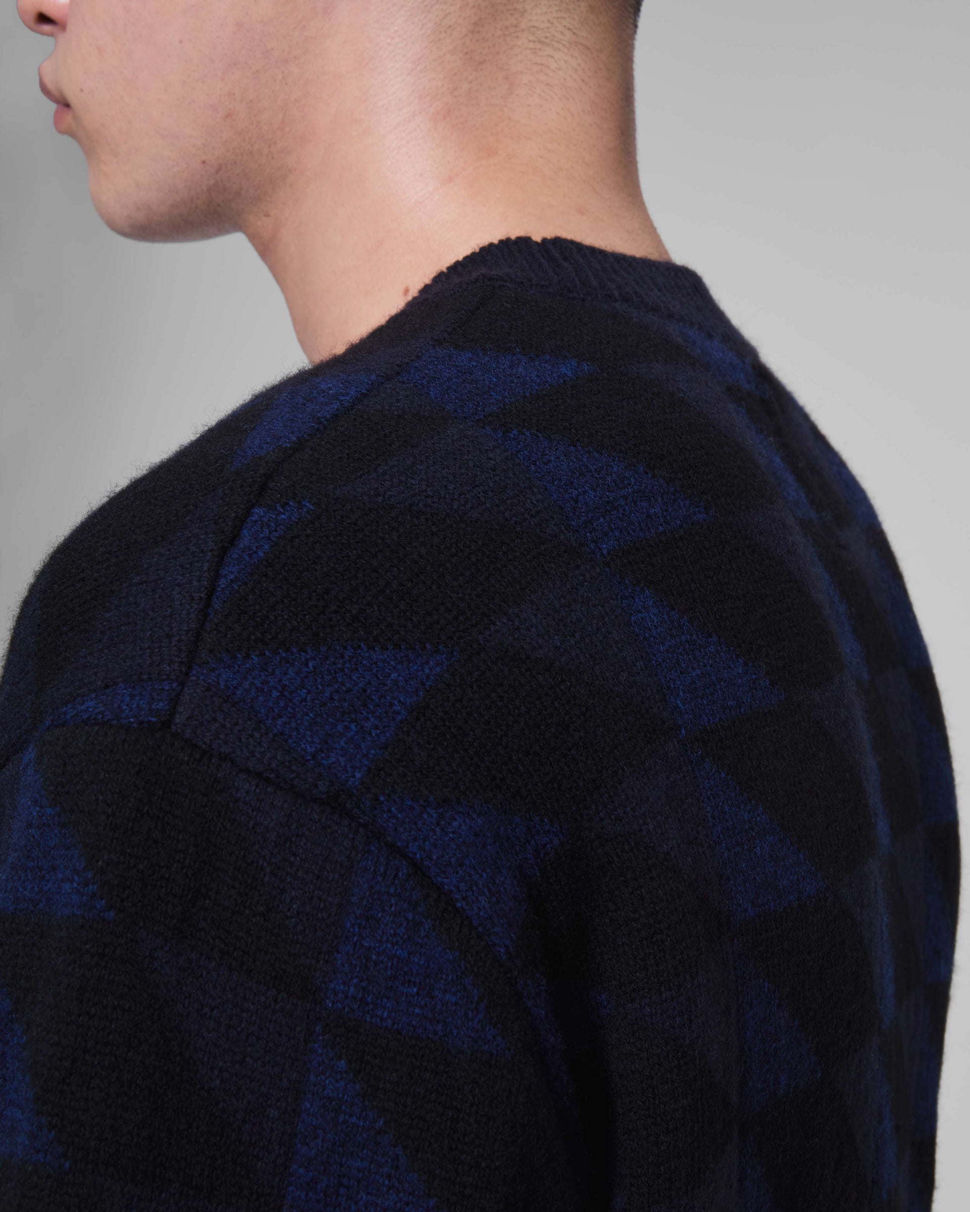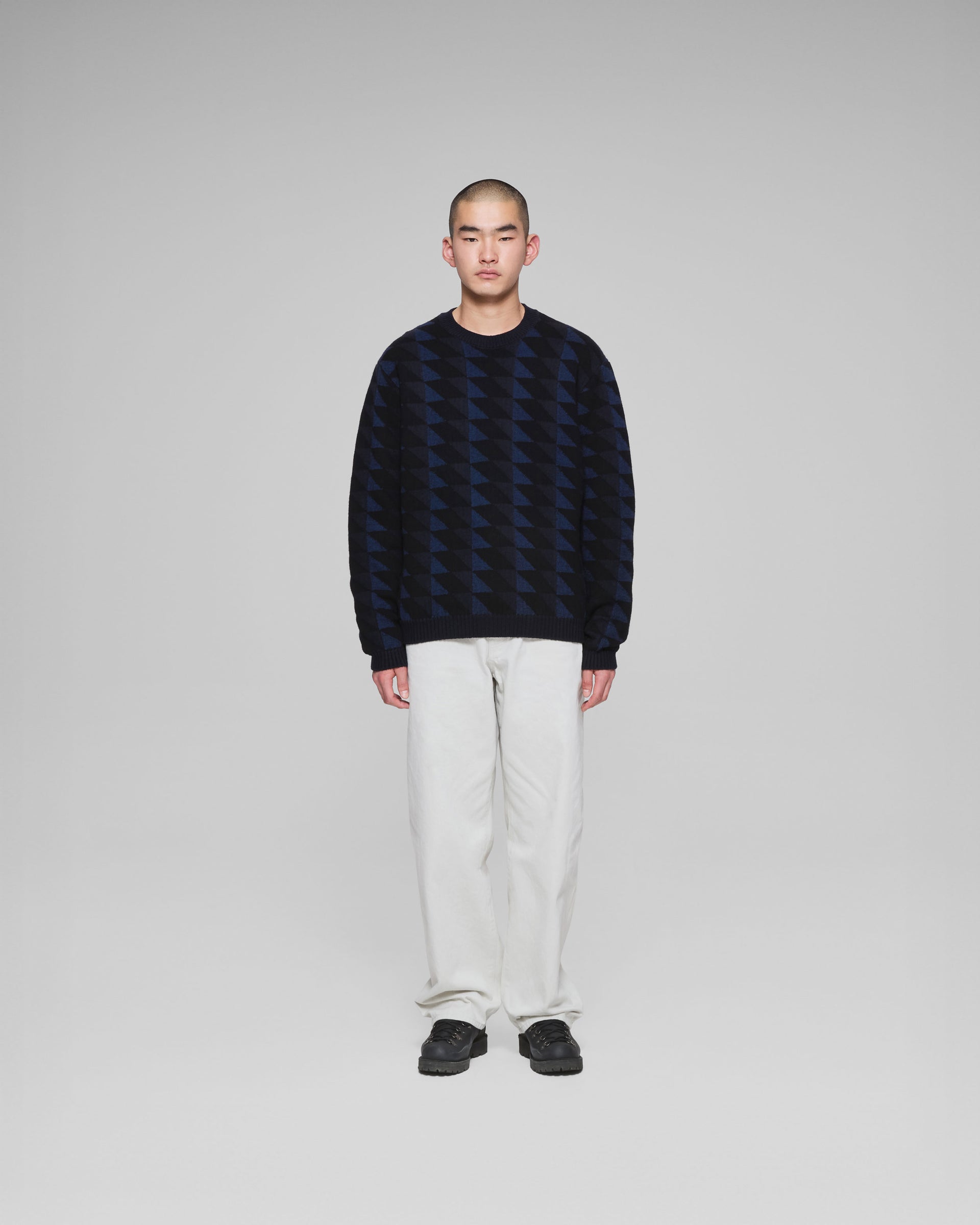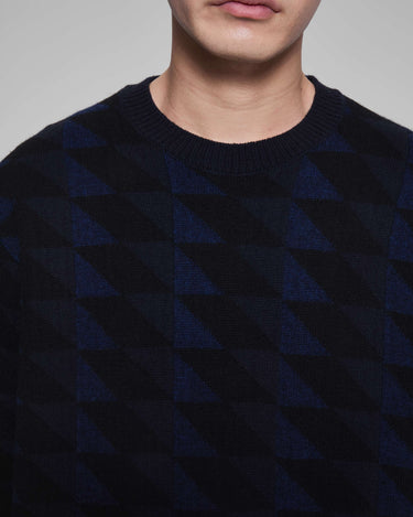 Ultra-fine merino wool knit sweater, featuring jacquard weave pattern and ribbed neck, cuffs, and hem opening.