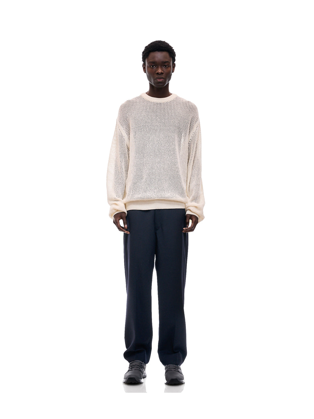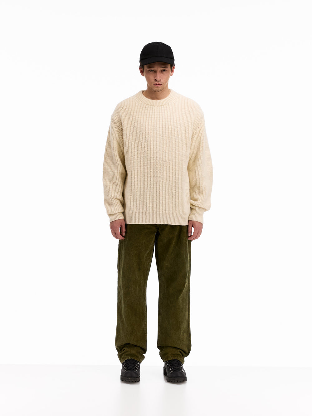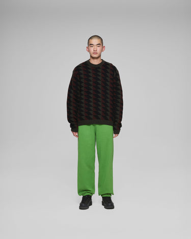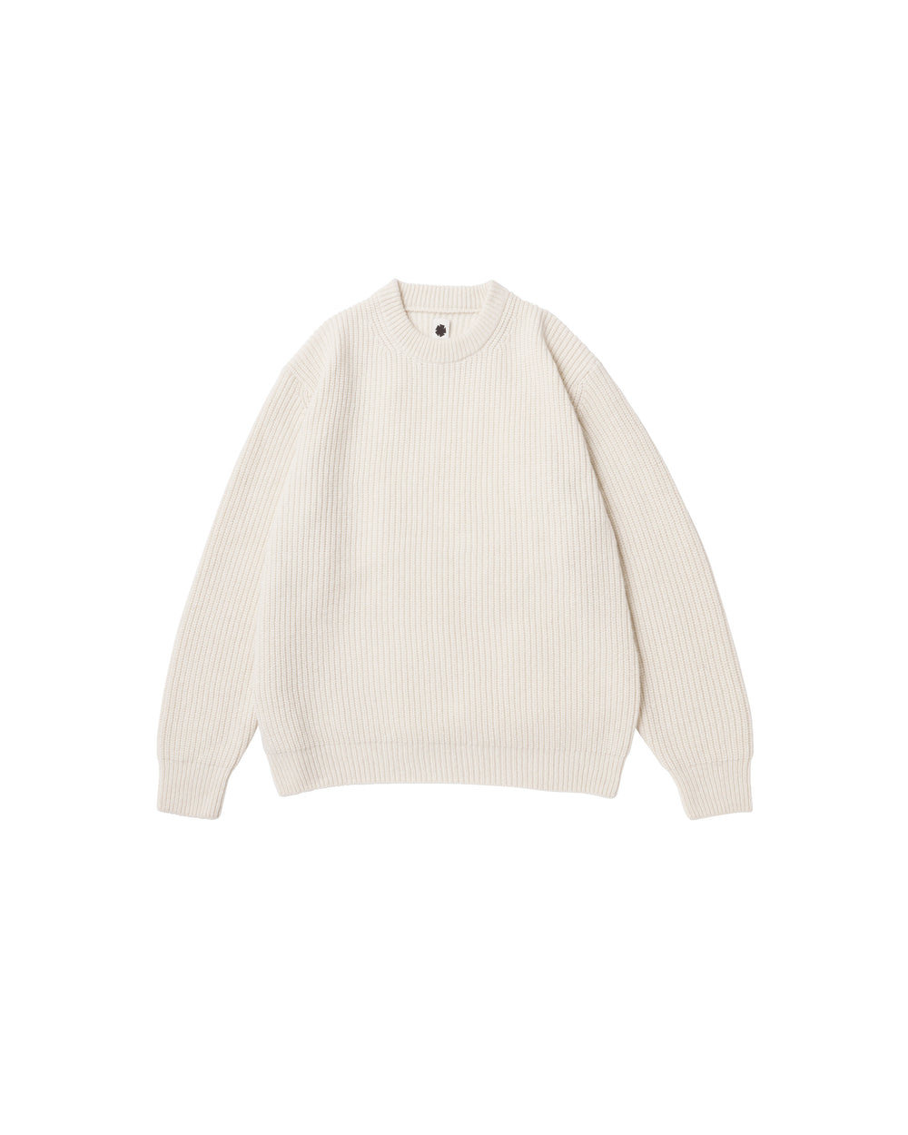 Ultra-fine merino wool knit sweater, featuring jacquard weave pattern and ribbed neck, cuffs, and hem opening.