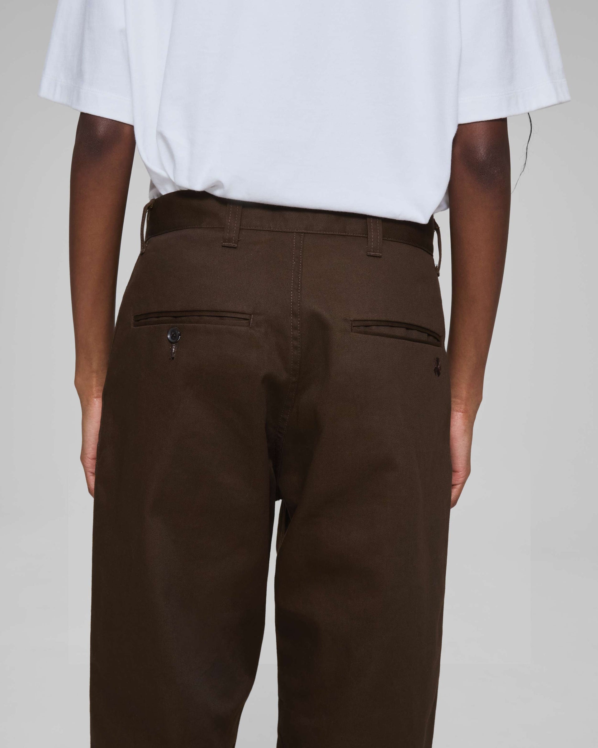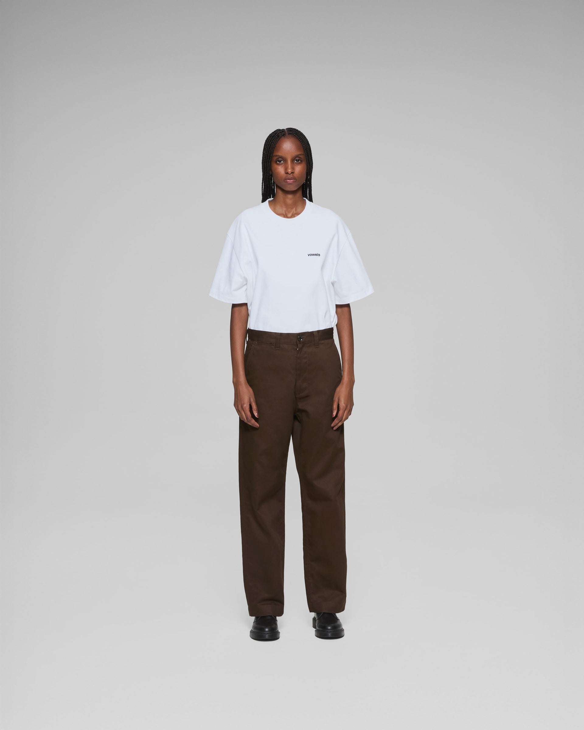 Relaxed straight fit five pocket chino work pant. Featuring slant pockets, coin pocket, with one button closure and one drop rear pockets, and embroidered vowels logo on rear right pocket. Reinforced along the hem and belt loops. Treated with cold mercerization process for a crisp glossy sheen.