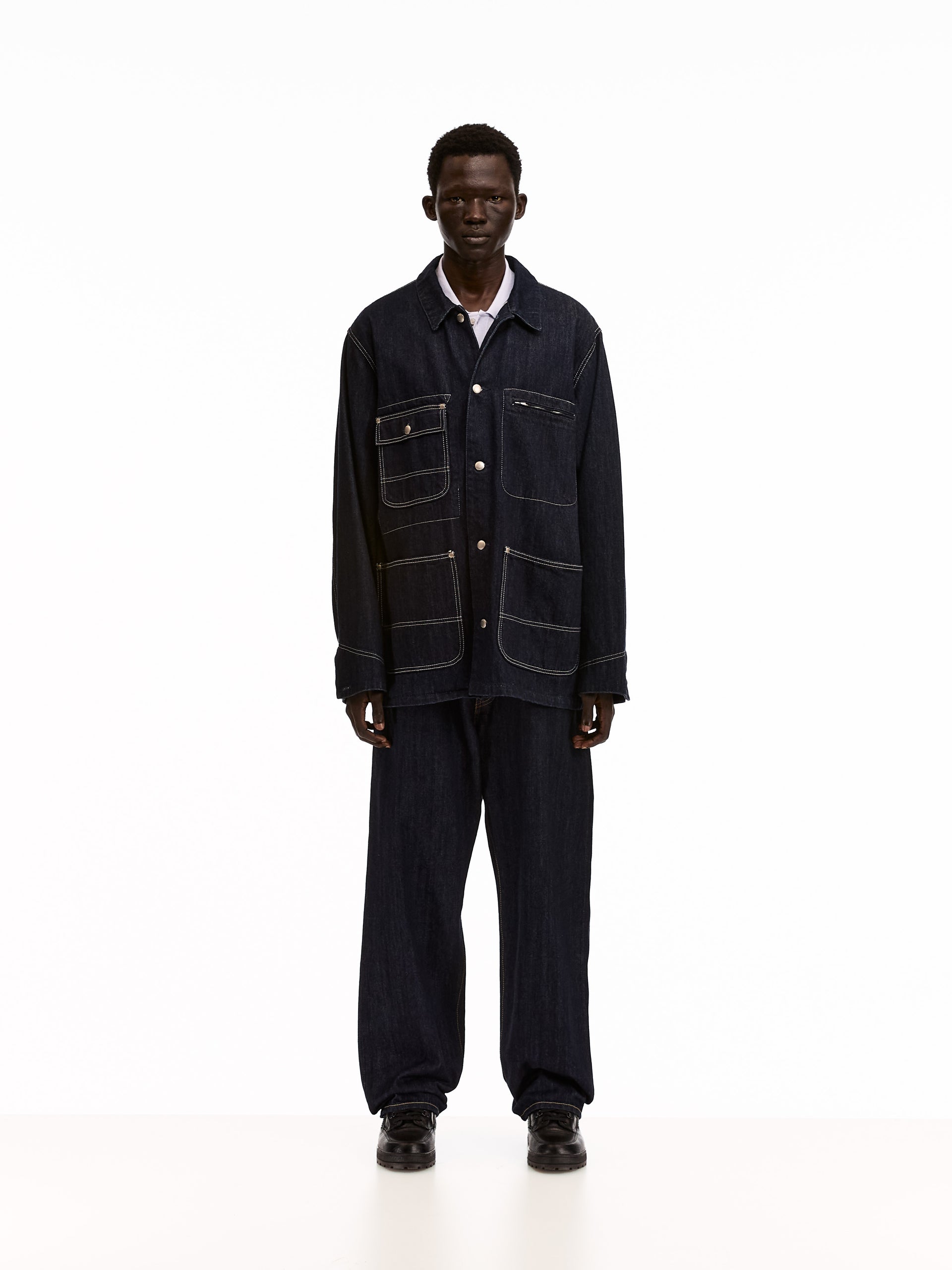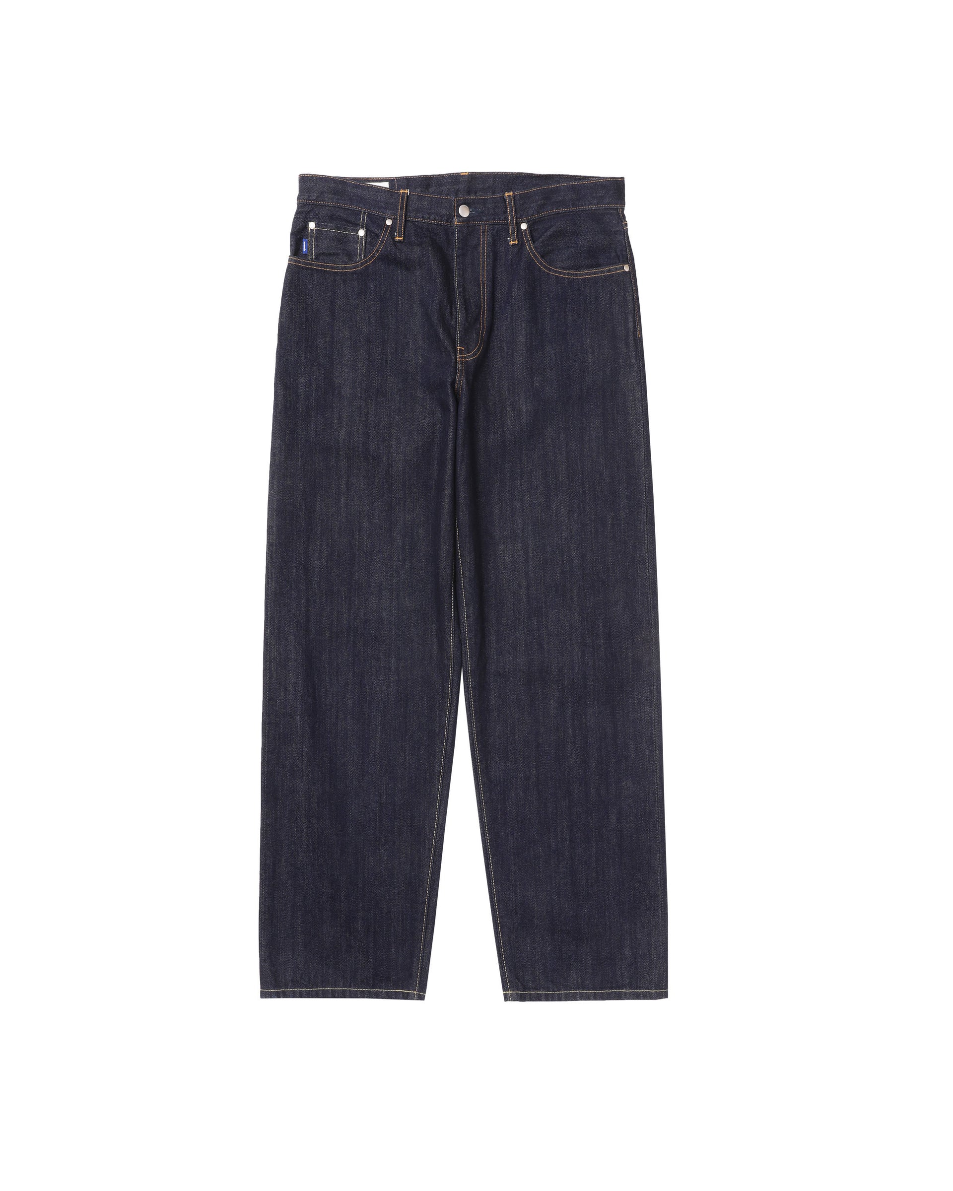 Selvedge shuttle loom denim. Featuring logo embossed rivets, logo tab on coin pocket, and custom logo patch. Cut for a relaxed, oversized fit. Taking inspiration from Levi's 66 model, for a natural, uneven look.