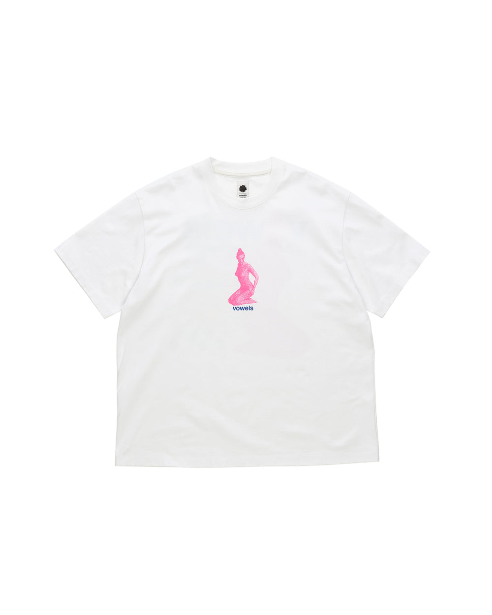 vowels wordmark interpretation screenprinted on a custom fit vowels Classic Tee, in an oversized waist length fit.