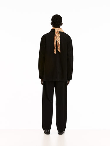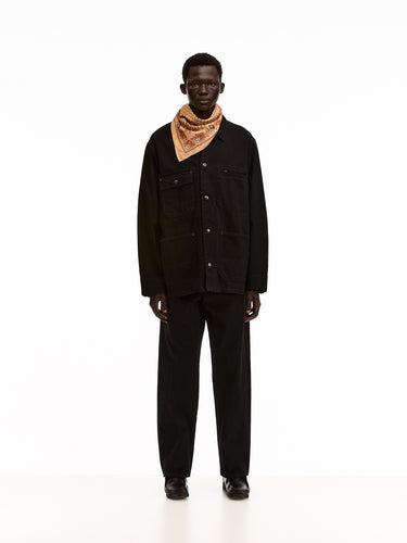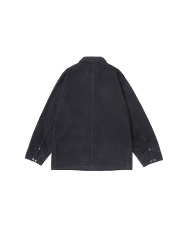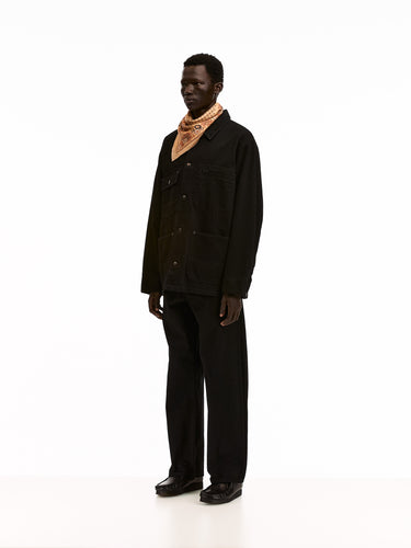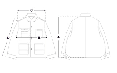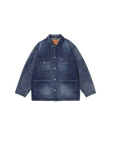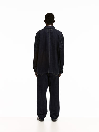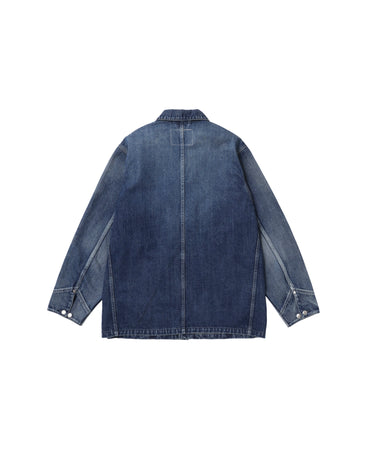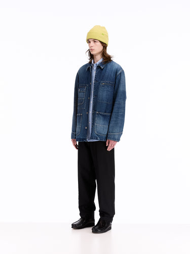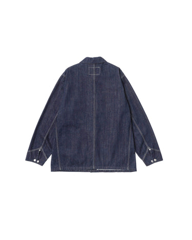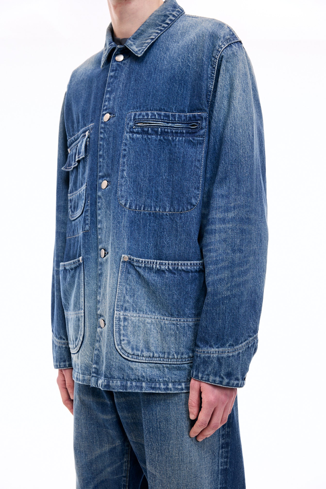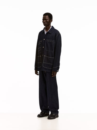 Selvedge denim jacket inspired by the classic French chore coat. Featuring custom logo embossed jeans buttons, "V" detail at sleeve closure, and vowels logo patch. Multiple exterior pockets including one zippered pocket, as well as one interior drop pocket.