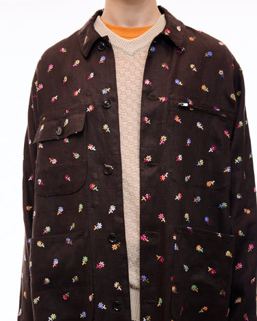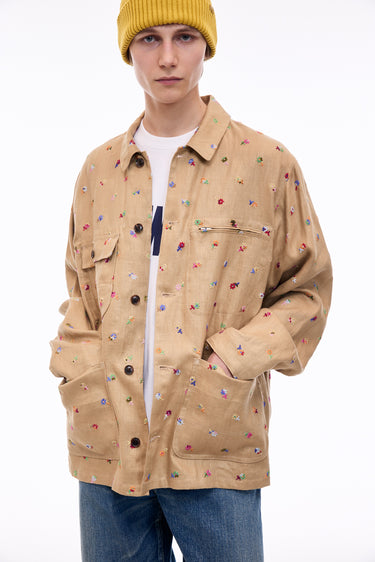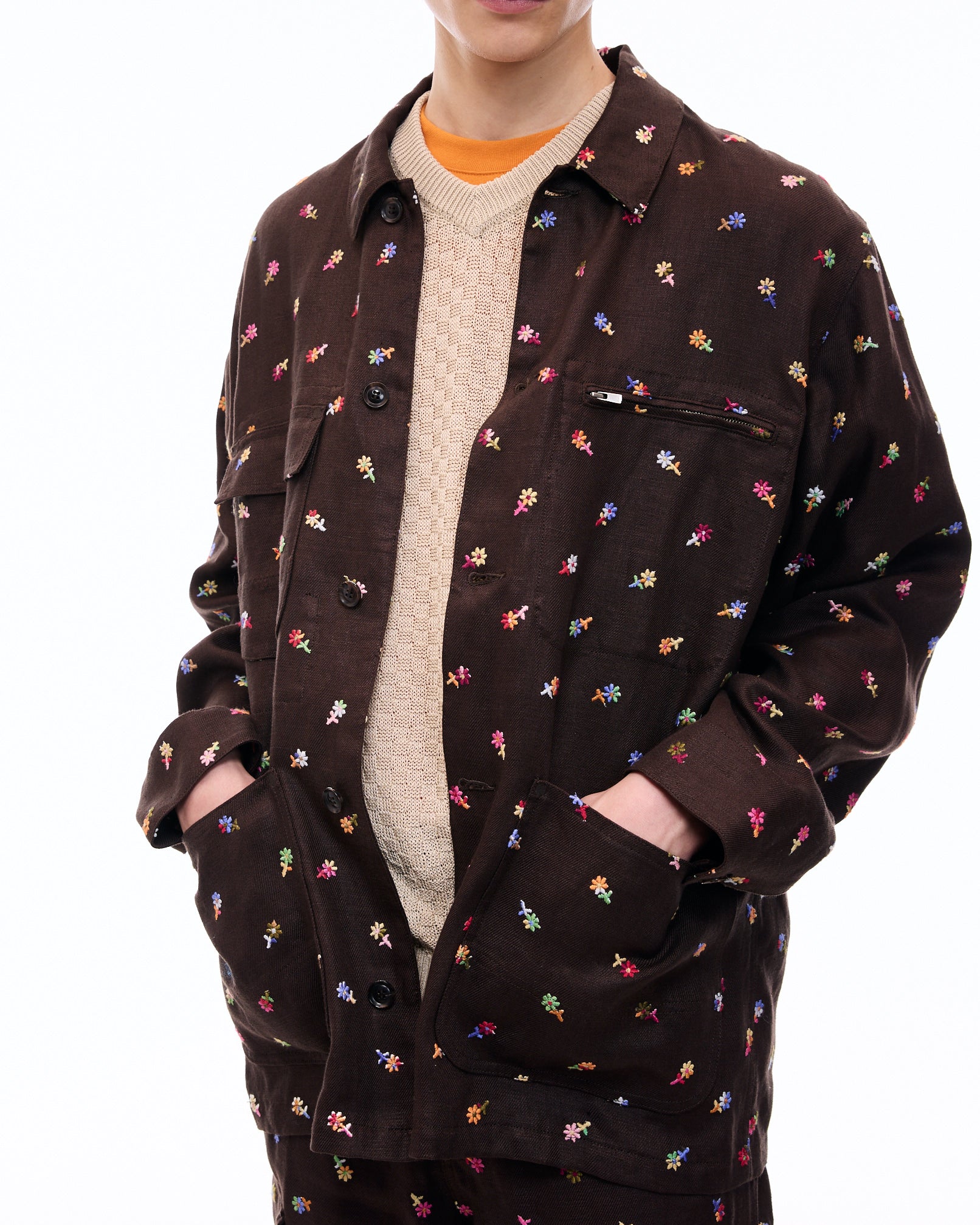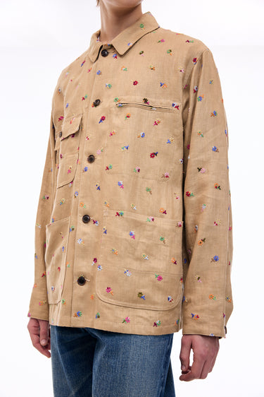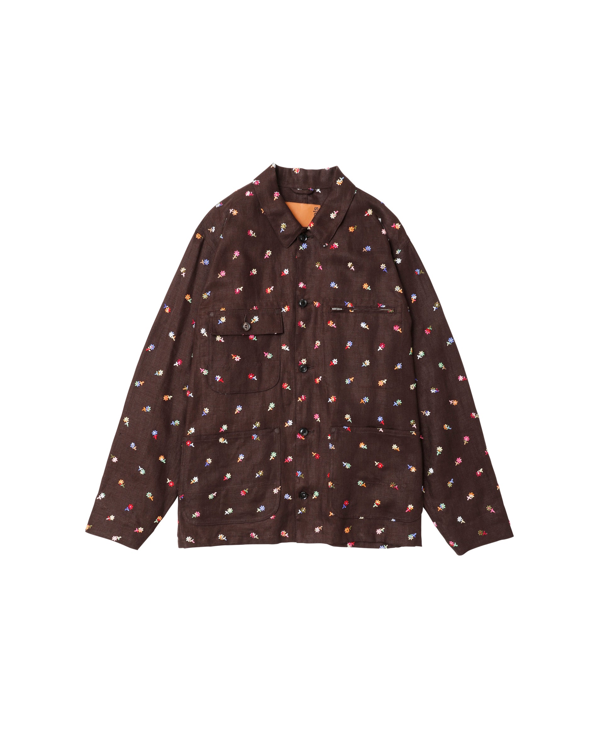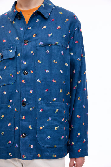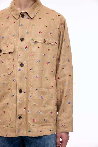Our signature Chore Jacket, reimagined in Safilin linen with an all over floral motif embroidered pattern. Merging our signature aesthetic with utilitarian details, the chore jacket features multiple outer pockets including one zippered pocket with custom hardware, and one lined interior drop pocket.
