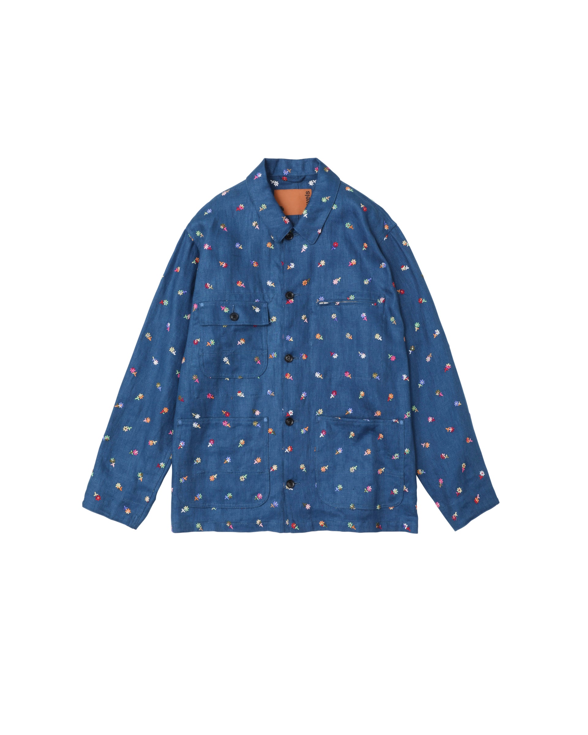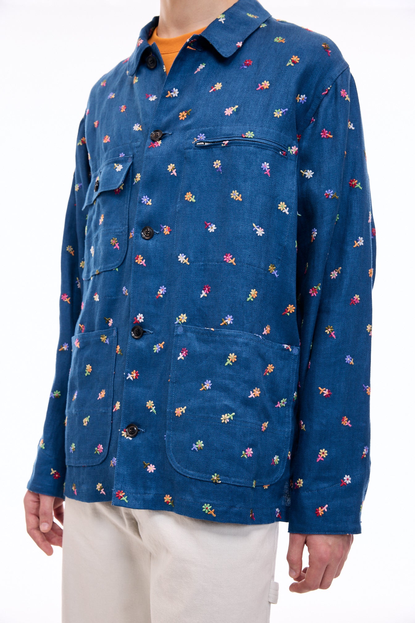 Our signature Chore Jacket, reimagined in Safilin linen with an all over floral motif embroidered pattern. Merging our signature aesthetic with utilitarian details, the chore jacket features multiple outer pockets including one zippered pocket with custom hardware, and one lined interior drop pocket.