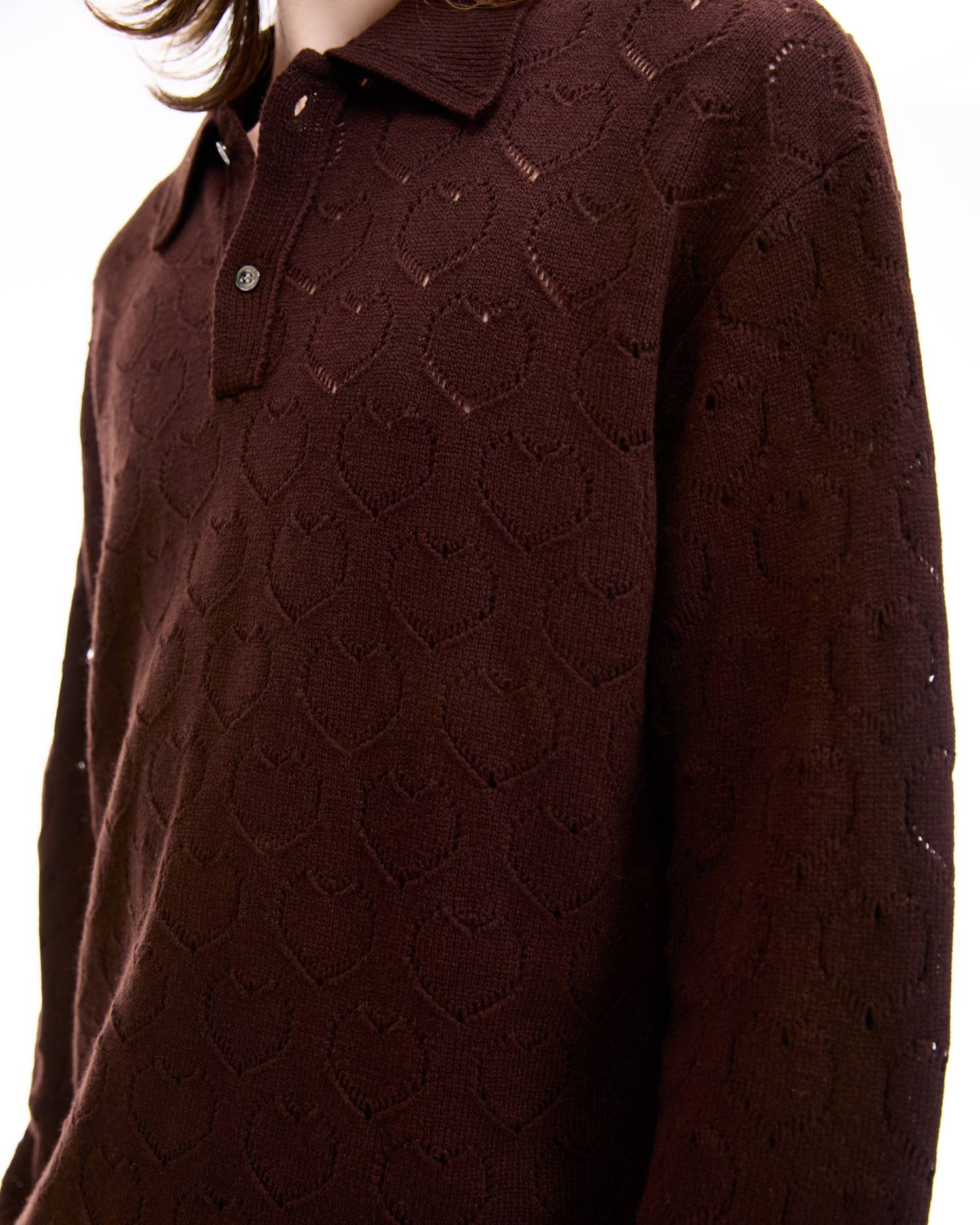 A knit longsleeve polo shirt, featuring a heart pattern created using fine wool yarn and eyelet knitting.
