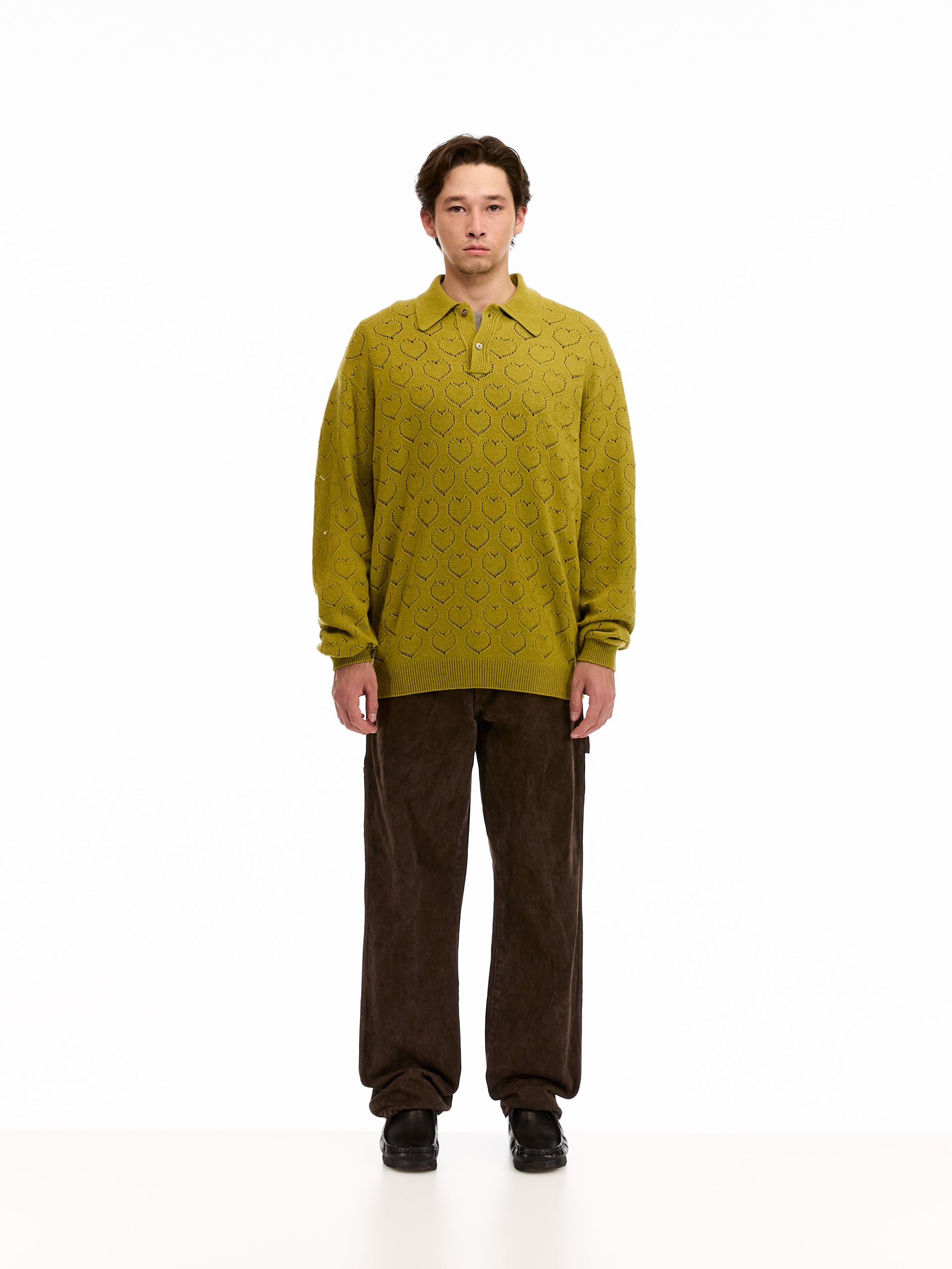 A knit longsleeve polo shirt, featuring a heart pattern created using fine wool yarn and eyelet knitting.