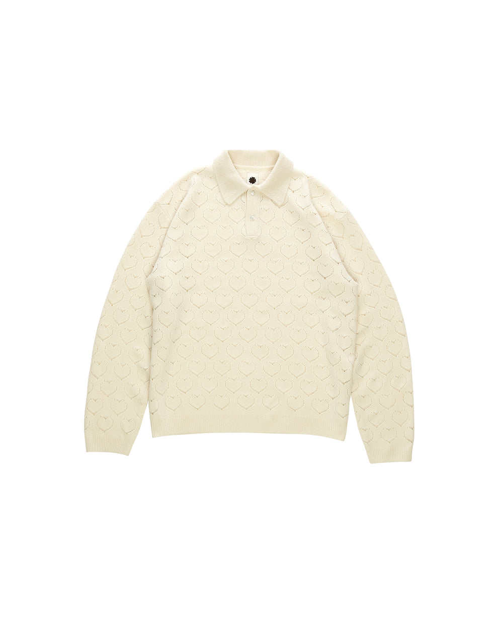 An open knit sweater vest featuring a heart pattern, woven through with delicate eyelet knitting. This tender design offers a soft and easy texture.