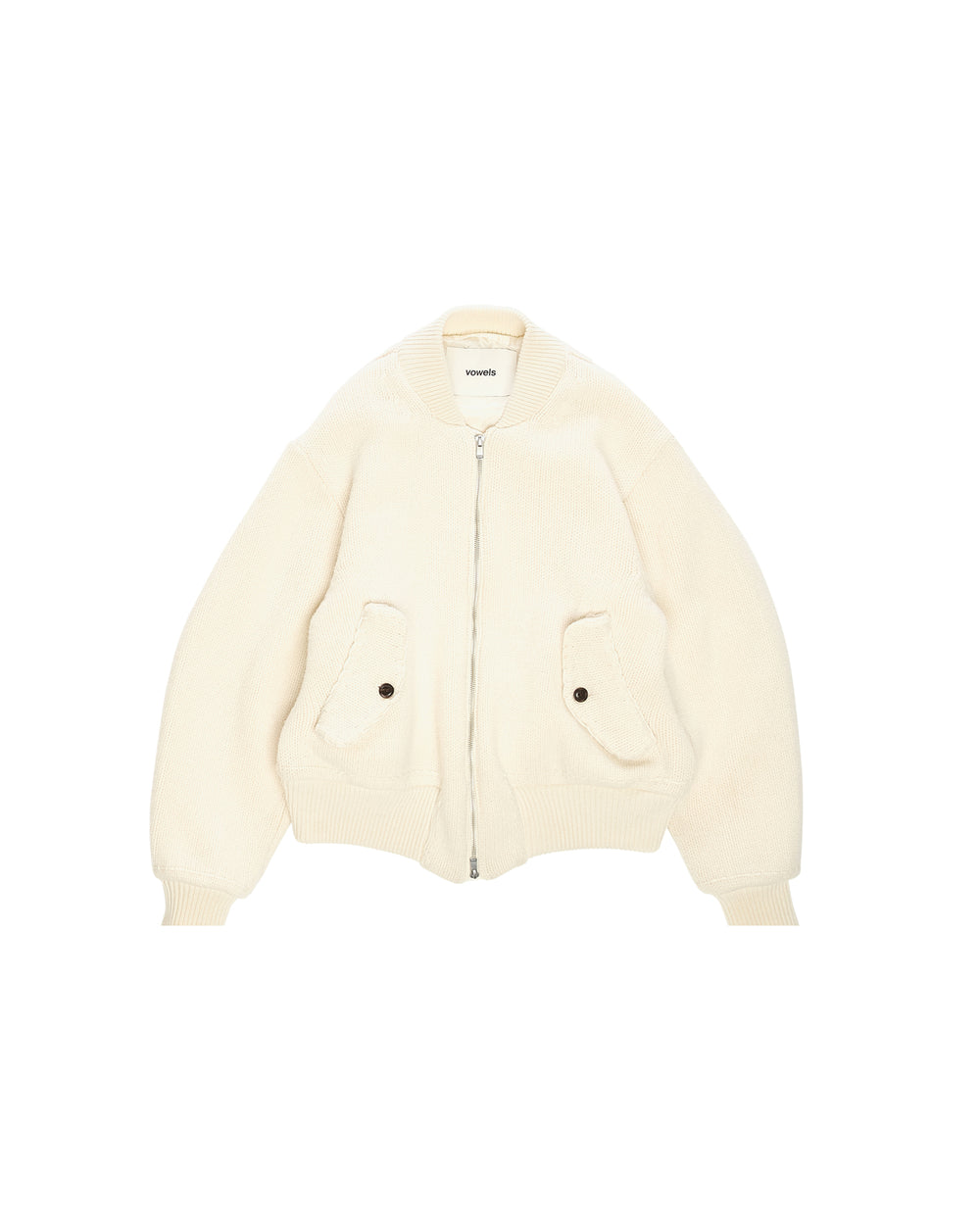 A wool MA-1 knit bomber jacket with a rounded silhouette. Hand stitched finishing on pockets, hem, cuffs, and sleeves.