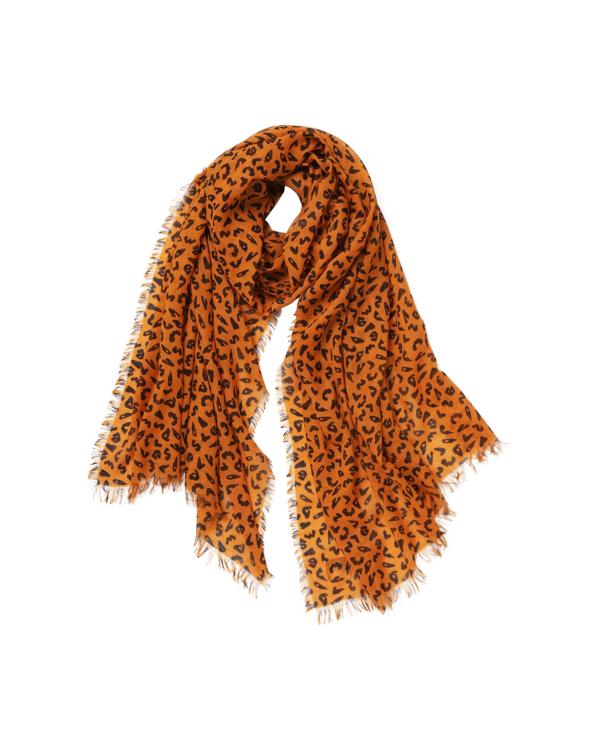 A custom vowels leopard print scarf, made with extra soft wool yarn.