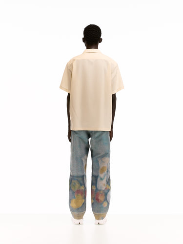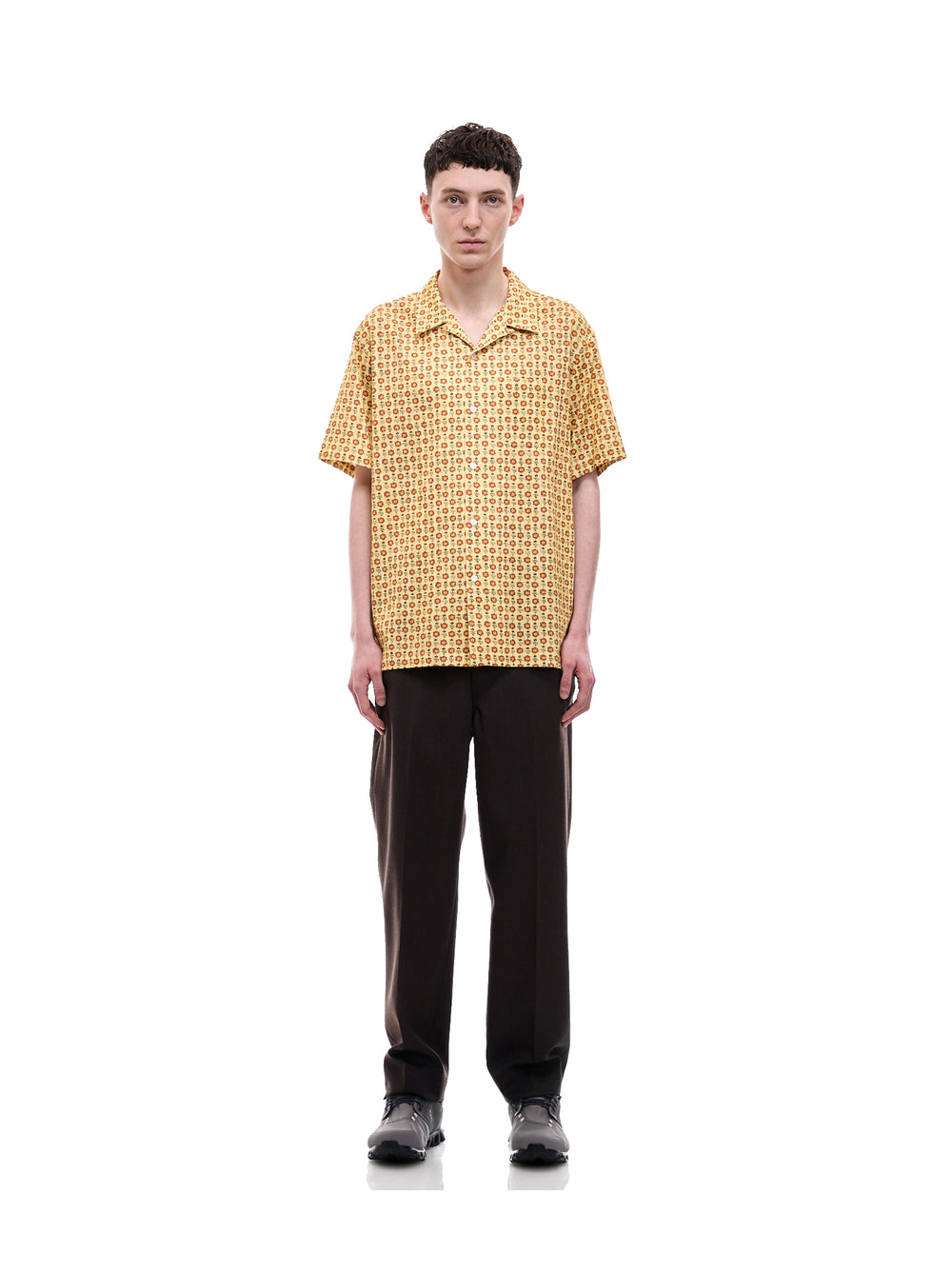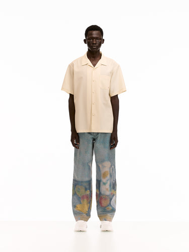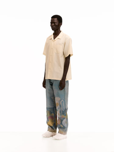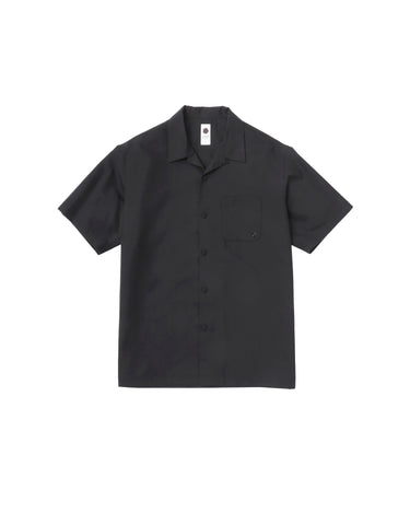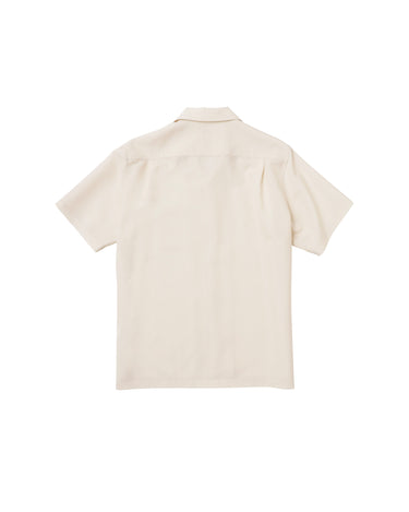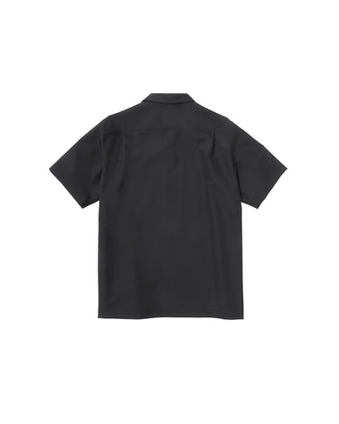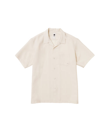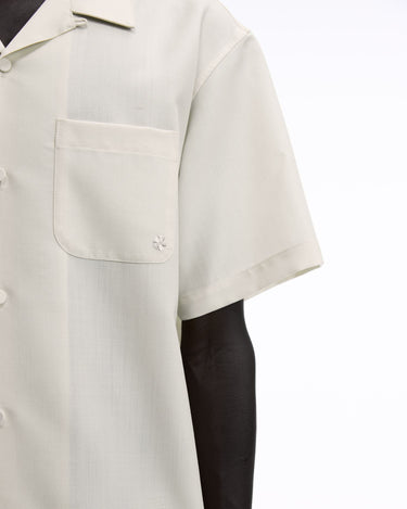 An open-collar wool-mohair shirt, with a sturdy handfeel and high-quality sheen.
