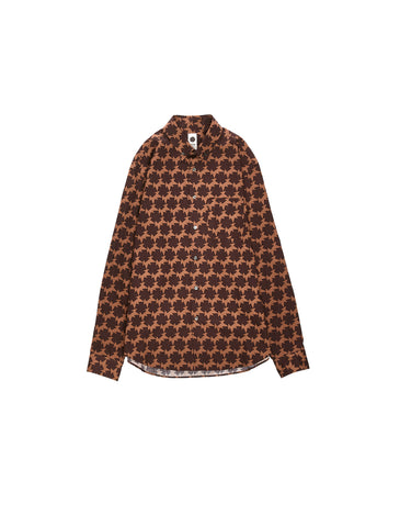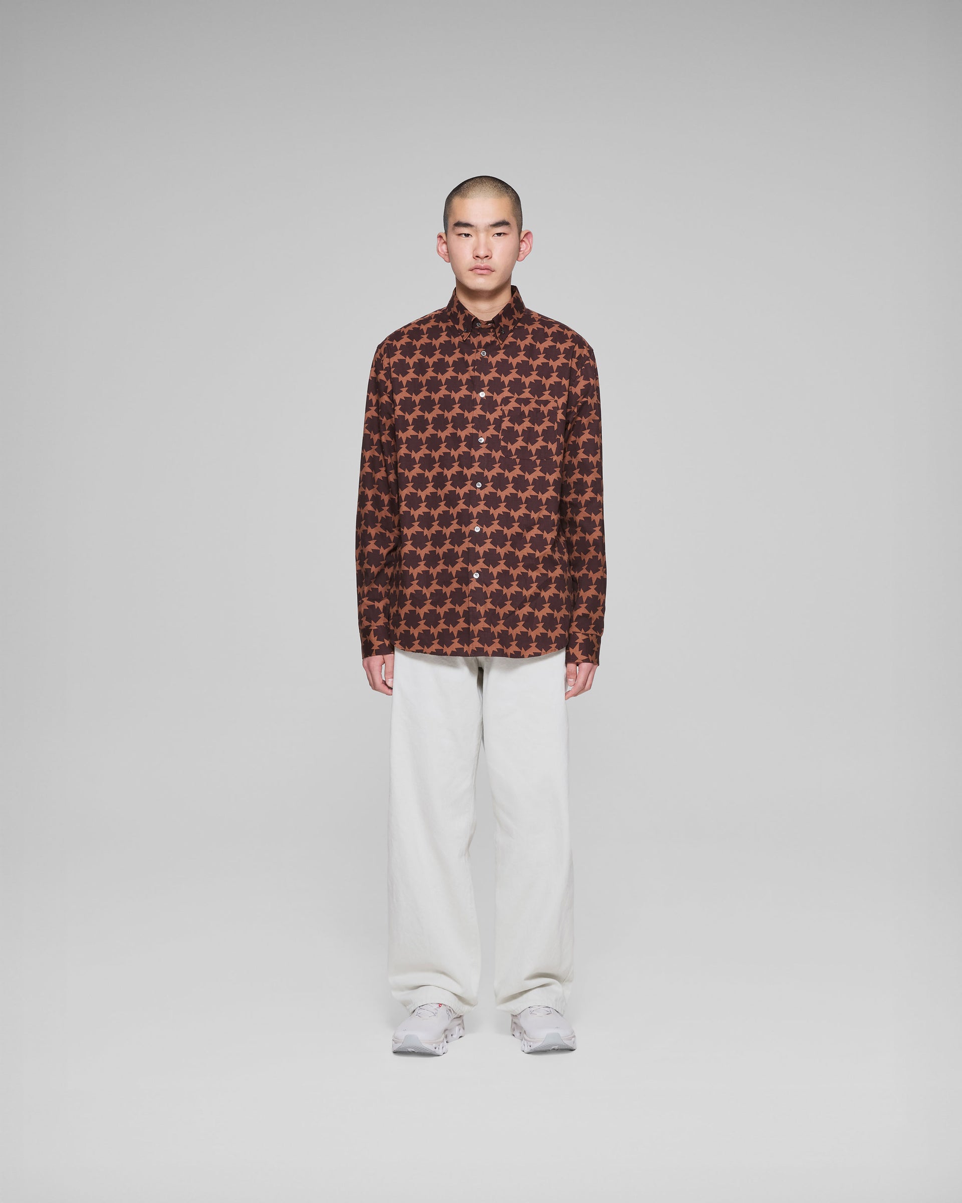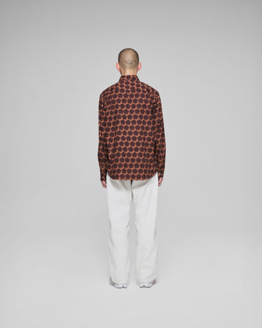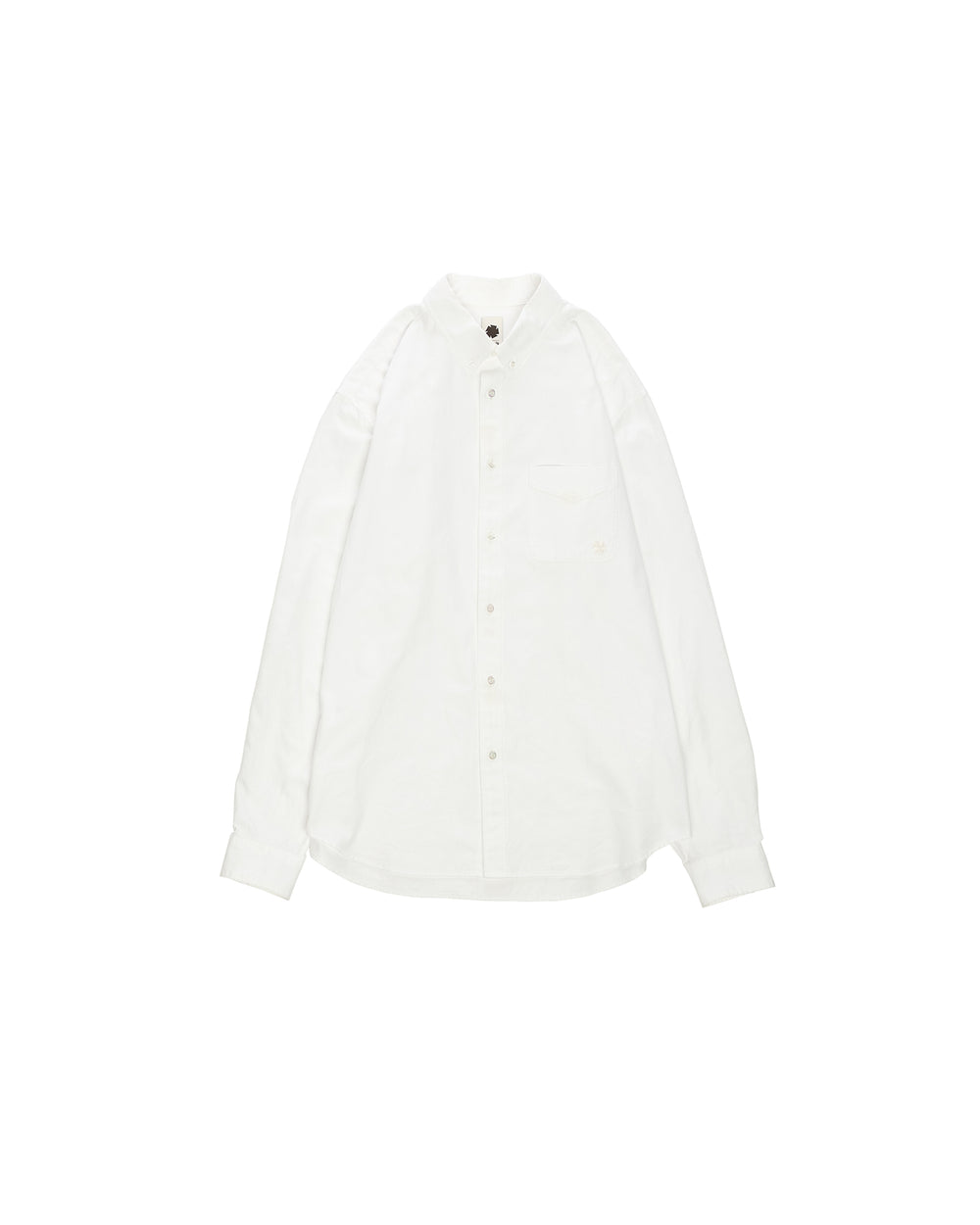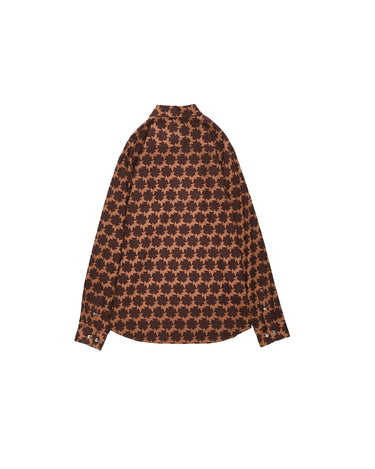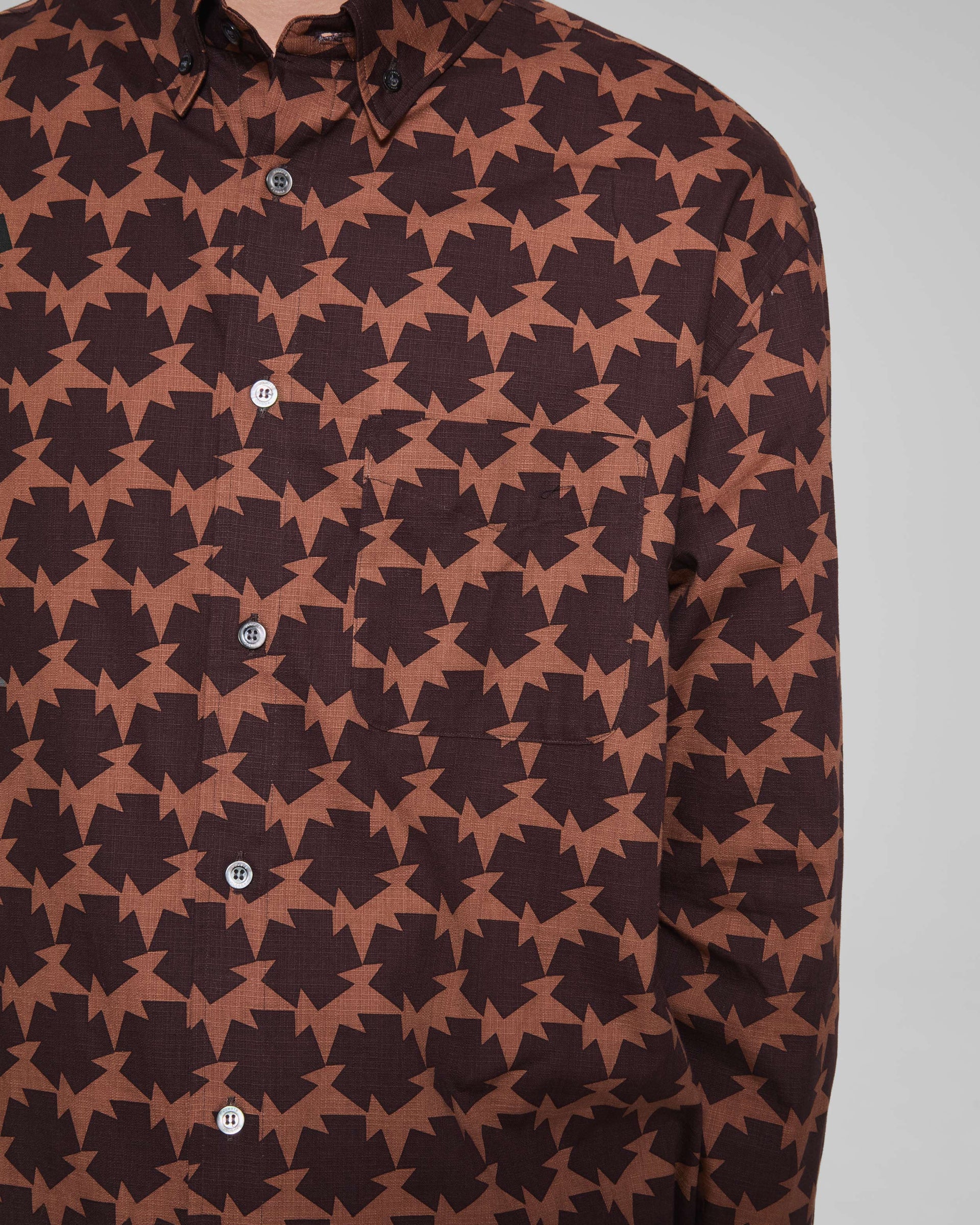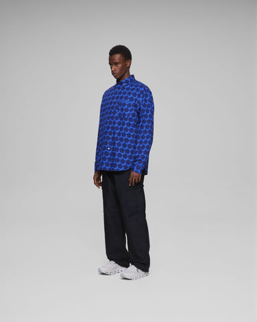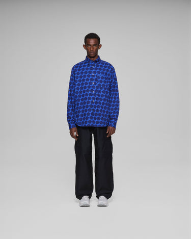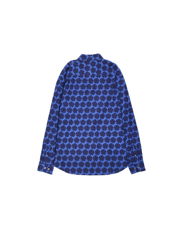 Button down shirt featuring tessellated vowels kamon symbol created by a unique hand dyeing process. With vowels engraved shell buttons, and patch pocket on chest featuring embroidered vowels kamon.