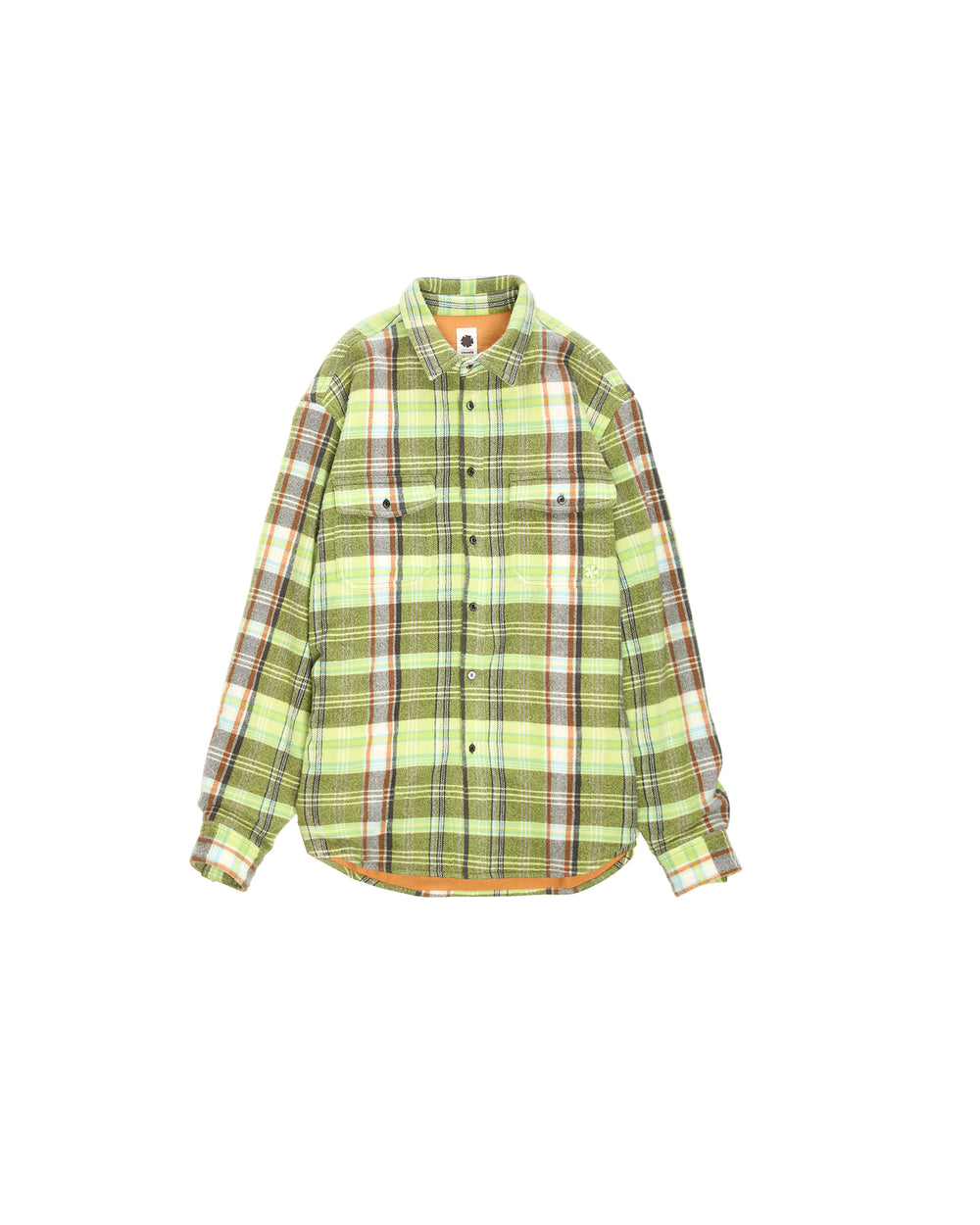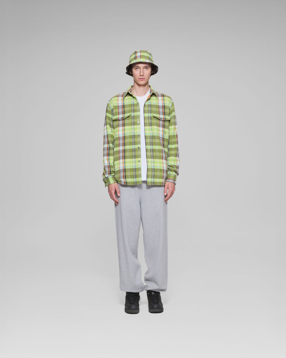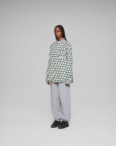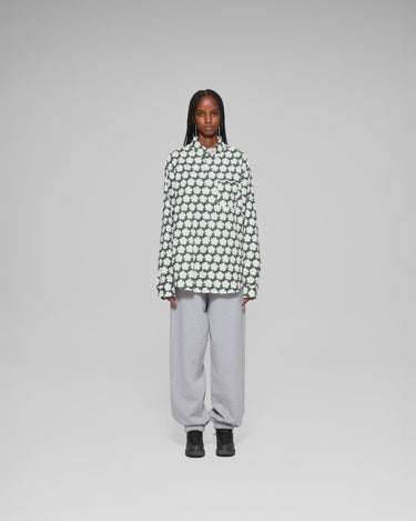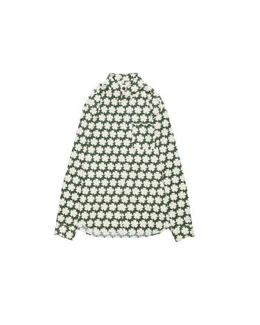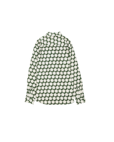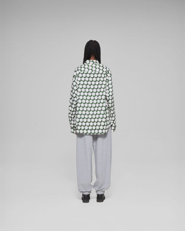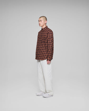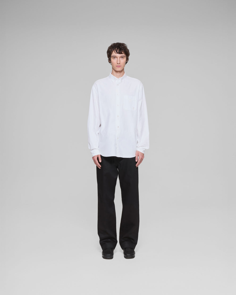 Button down shirt featuring tessellated vowels kamon symbol created by a unique hand dyeing process. With vowels engraved shell buttons, and patch pocket on chest featuring embroidered vowels kamon.