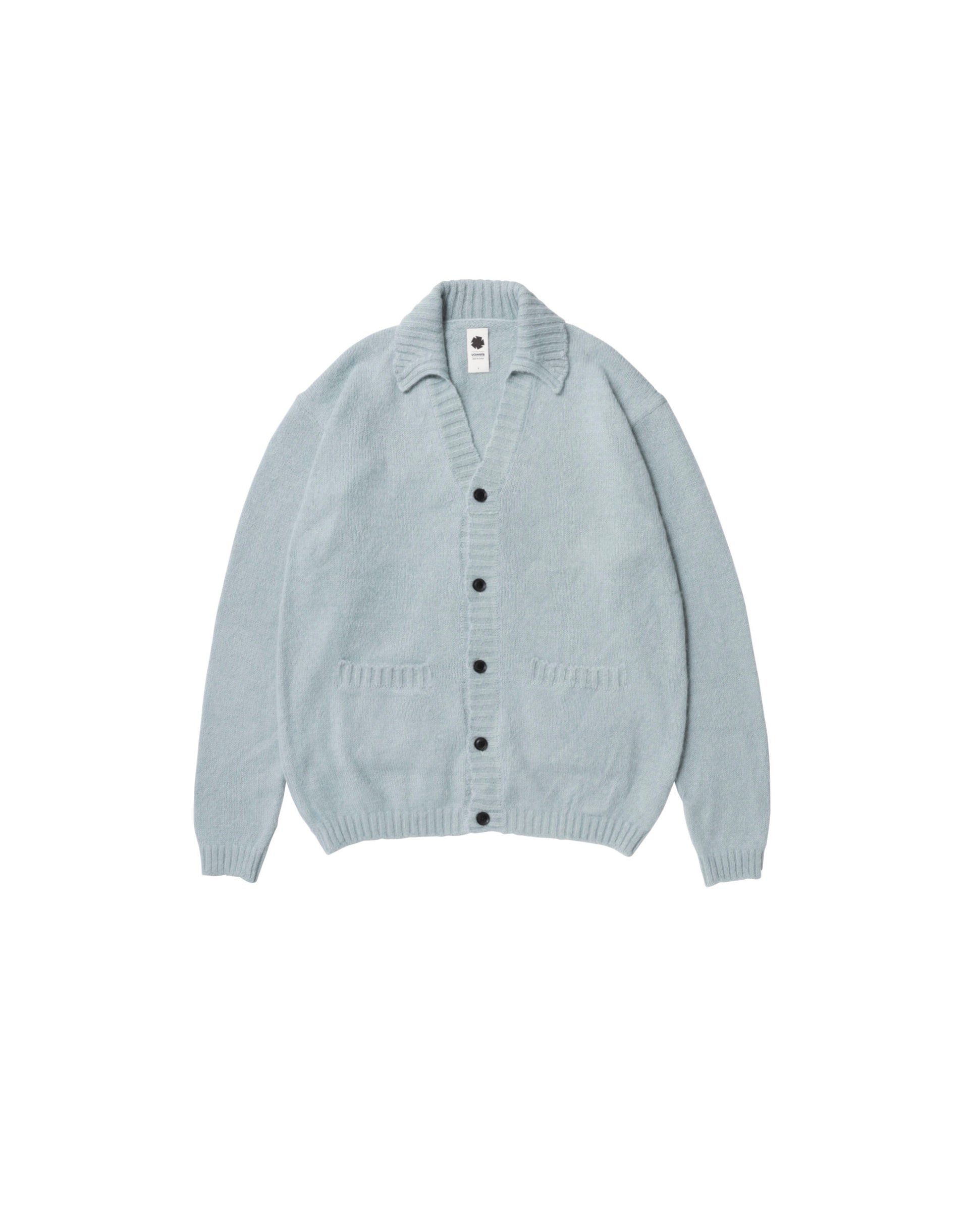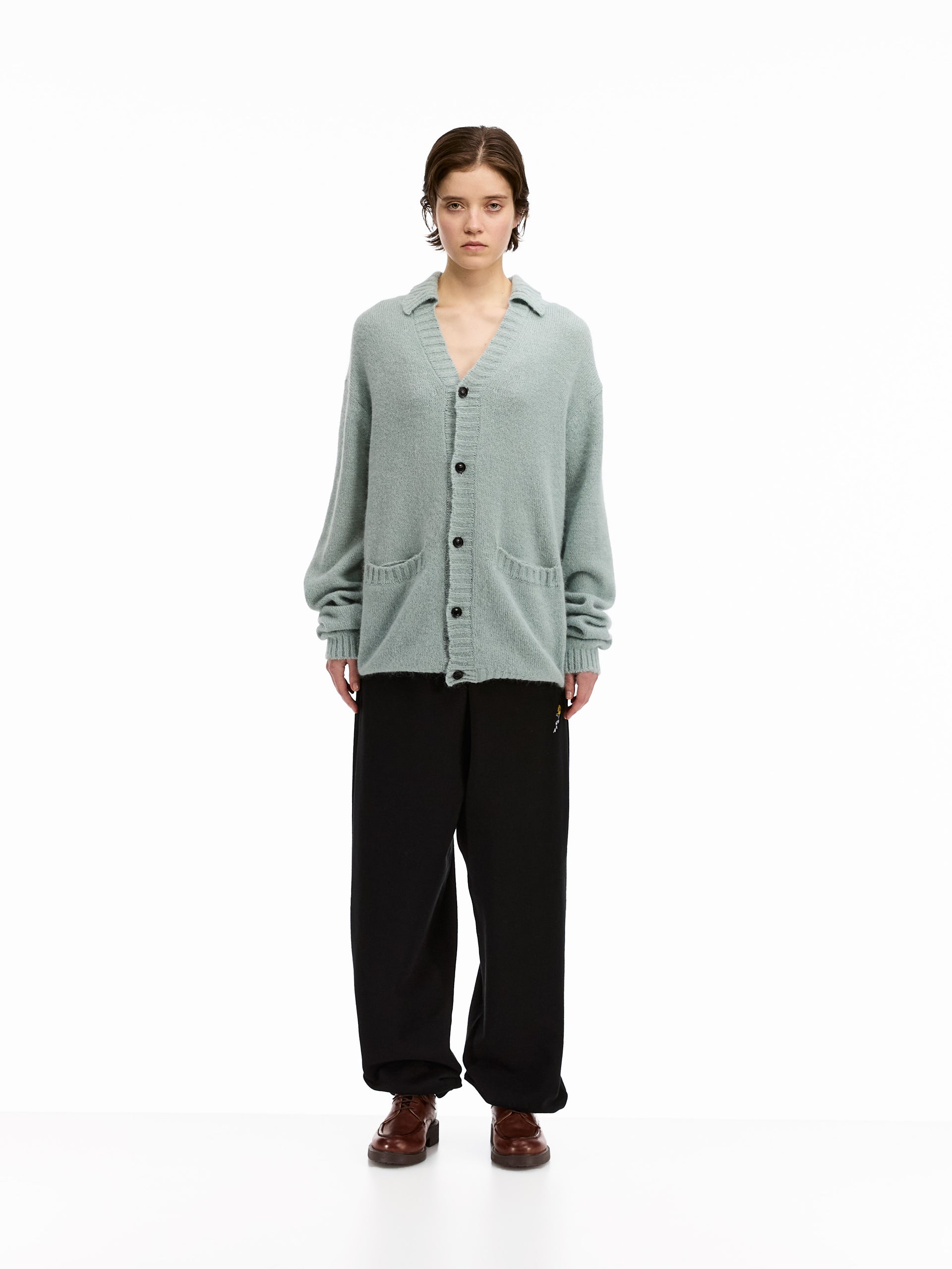 A relaxed fit V-neck cardigan, featuring a shirt-style collar, made with alpaca wool.