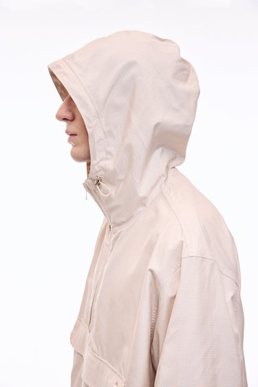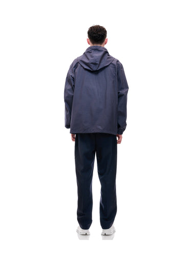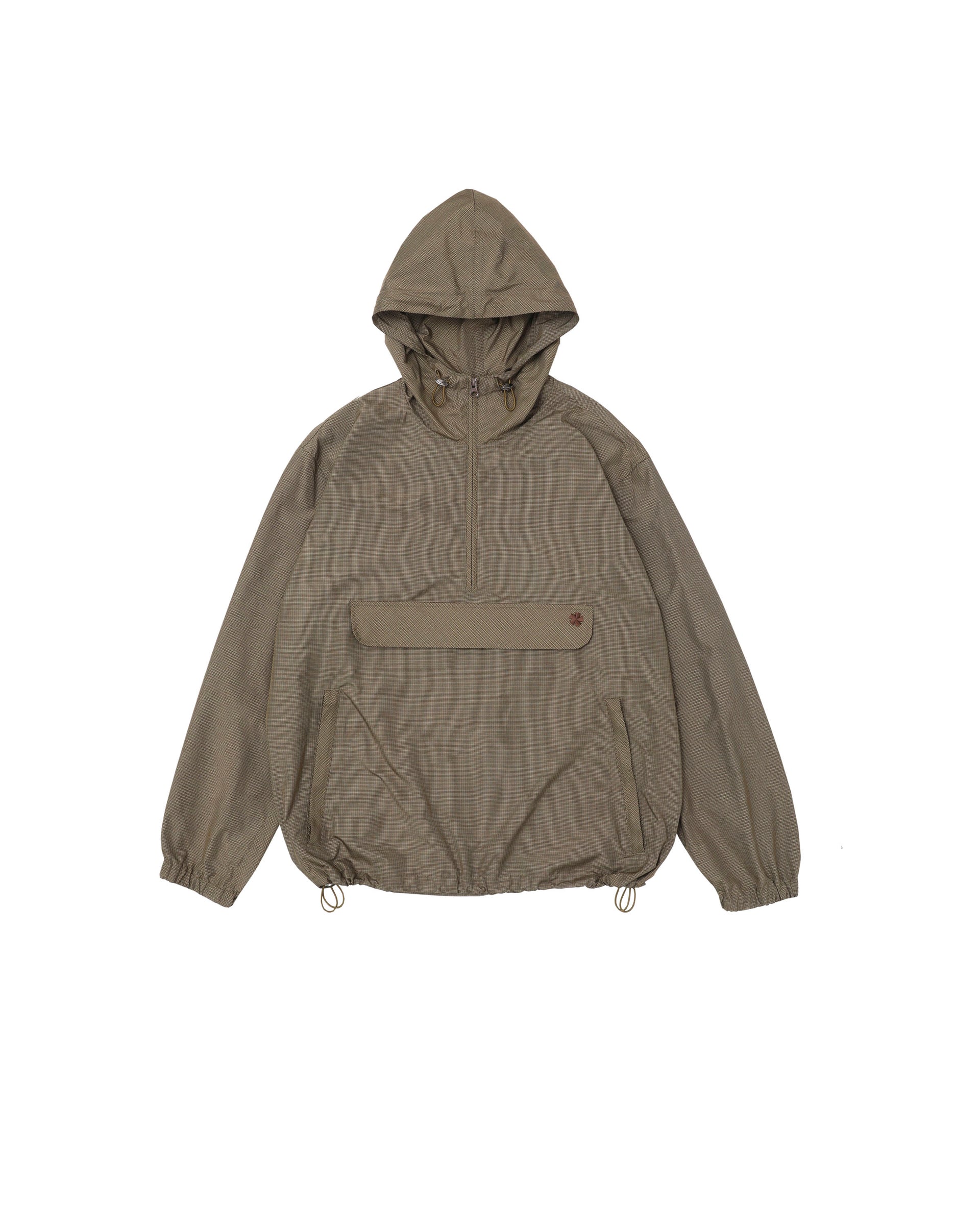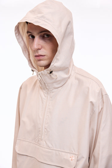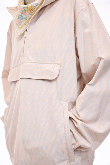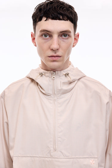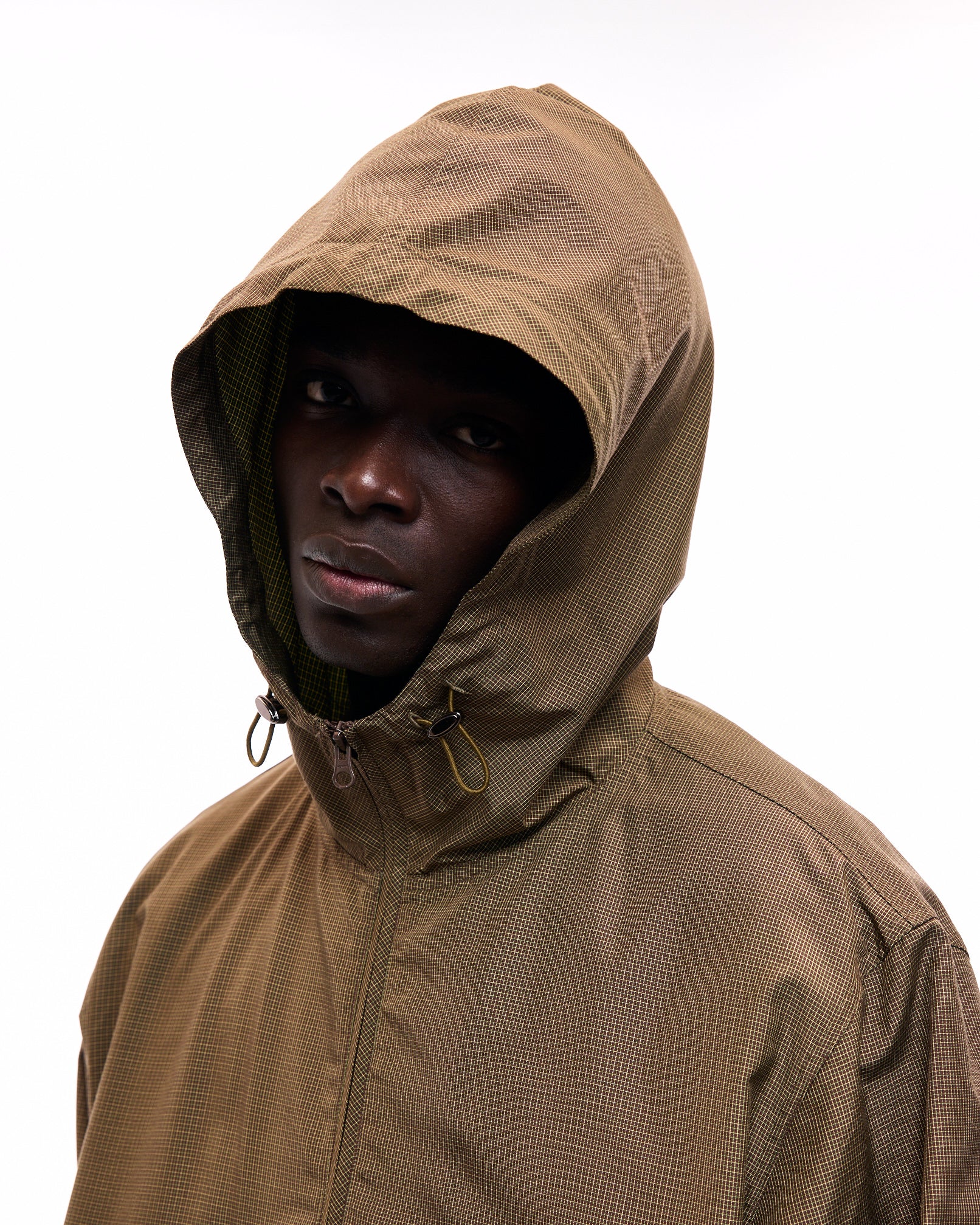 A utilitarian and refined anorak made from high sheen checkered silk. Matching form with functionality, the jacket is fully packable, utilizing its own pocket as a stuff sack, and features vowels kamon embroidery on the pocket flap, with custom zipper hardware, drawstring adjustable hem, and elasticized cuffs.