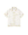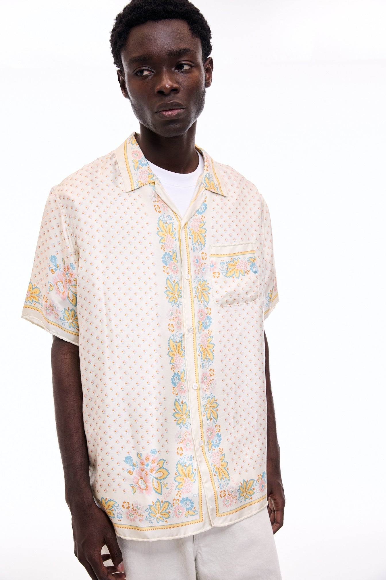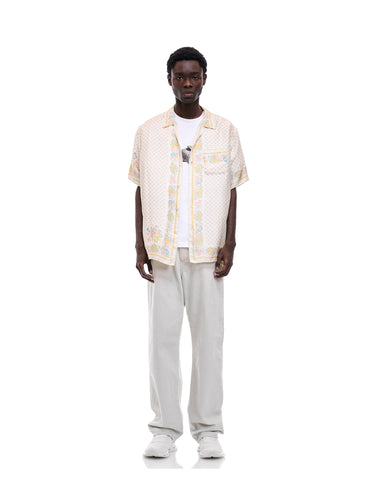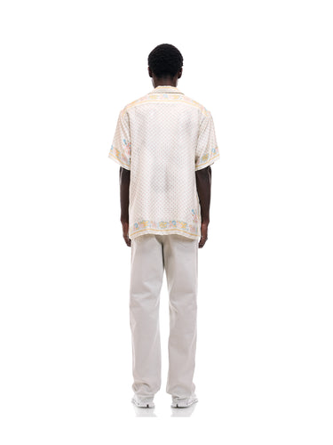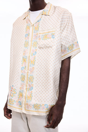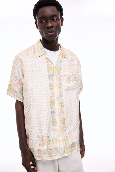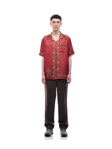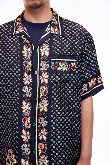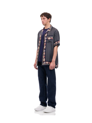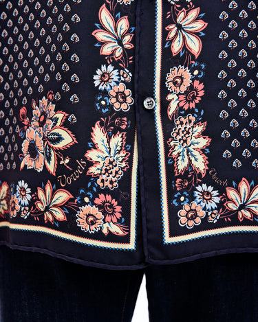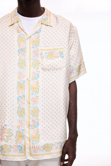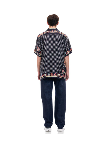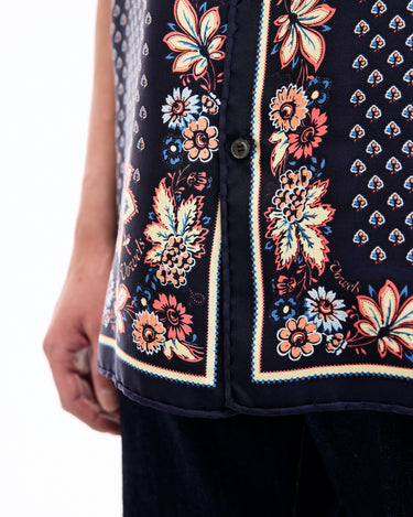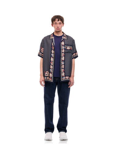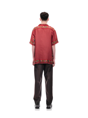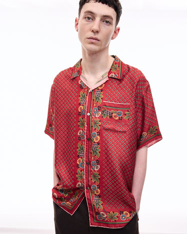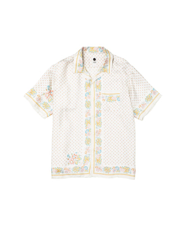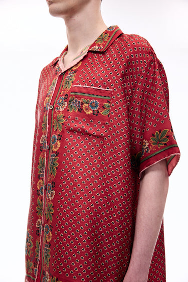 A lush shirt crafted from silk scarves, showcasing intricate artisanal techniques. The silk fabric is minimally twisted and woven on a shuttle loom to maintain its delicate quality and finish, with a expertly printed pattern. The edges of the front, hem, cuffs, and pocket are finished with a hand-rolled hem, a skill mastered by only a few artisans in Japan.