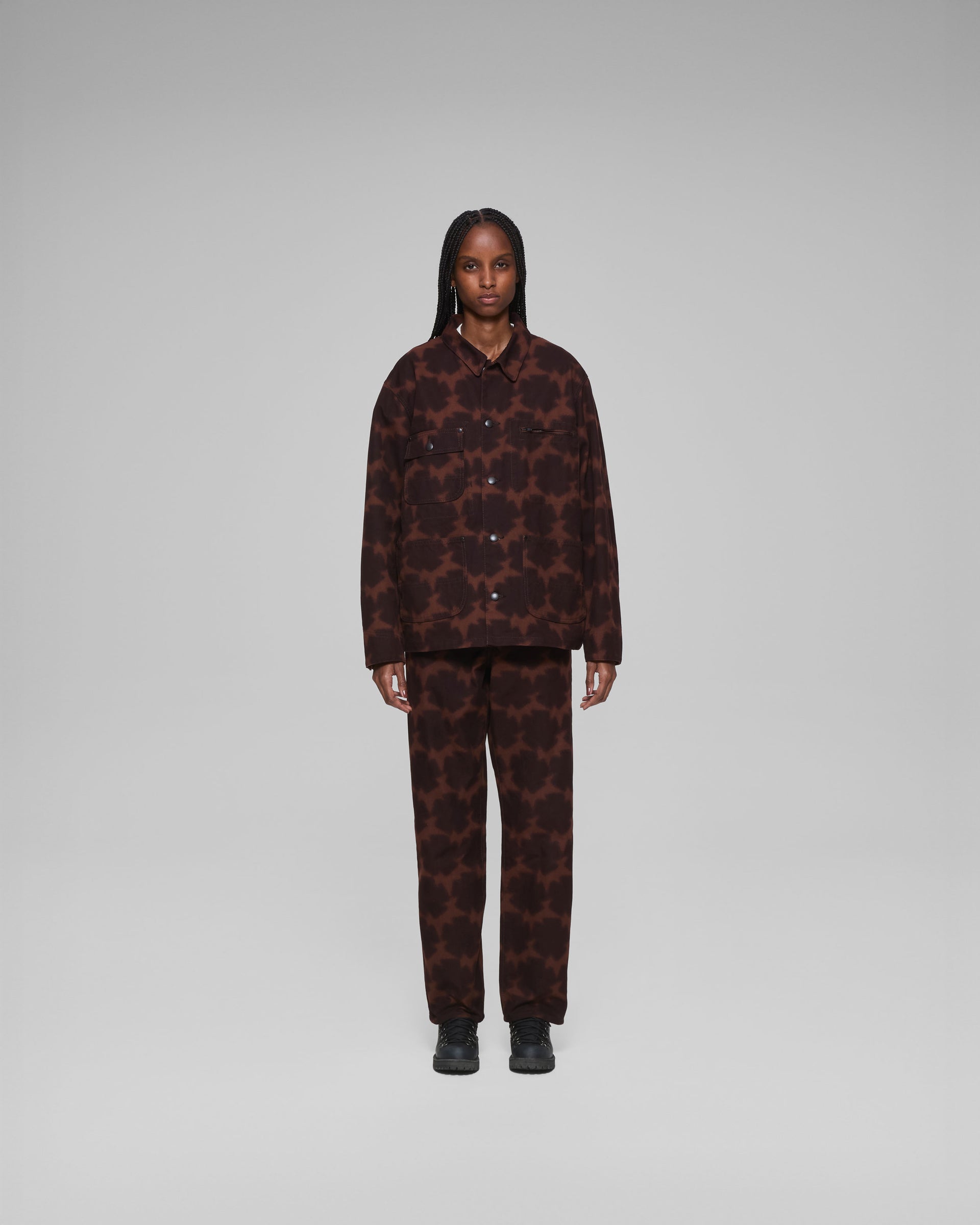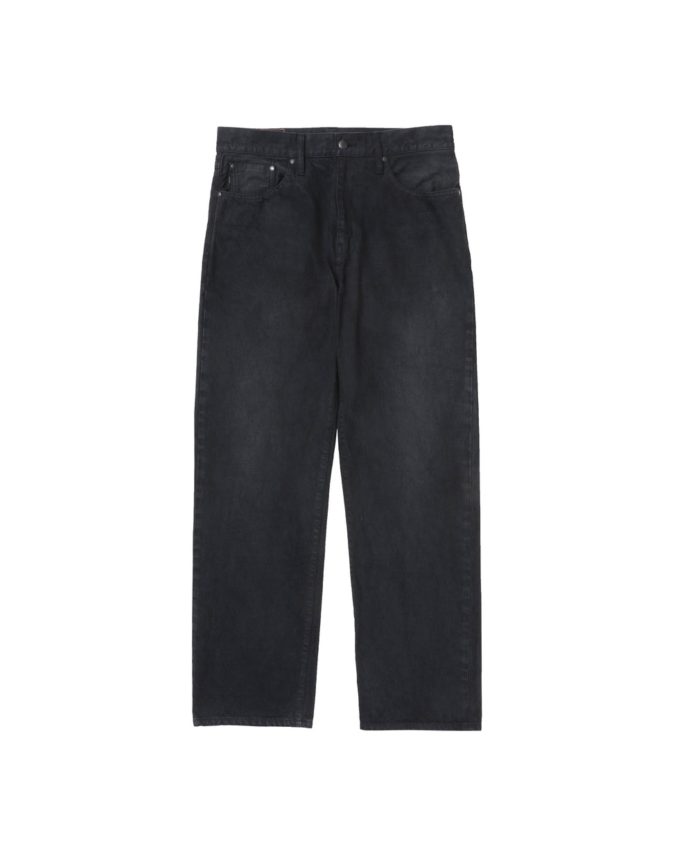 Straight fit 10 oz canvas denim, with a semi-auto dyed tessellated vowels kamon logo. Features embossed rivets, logo tab on coin pocket, and custom paper patch on rear waist.