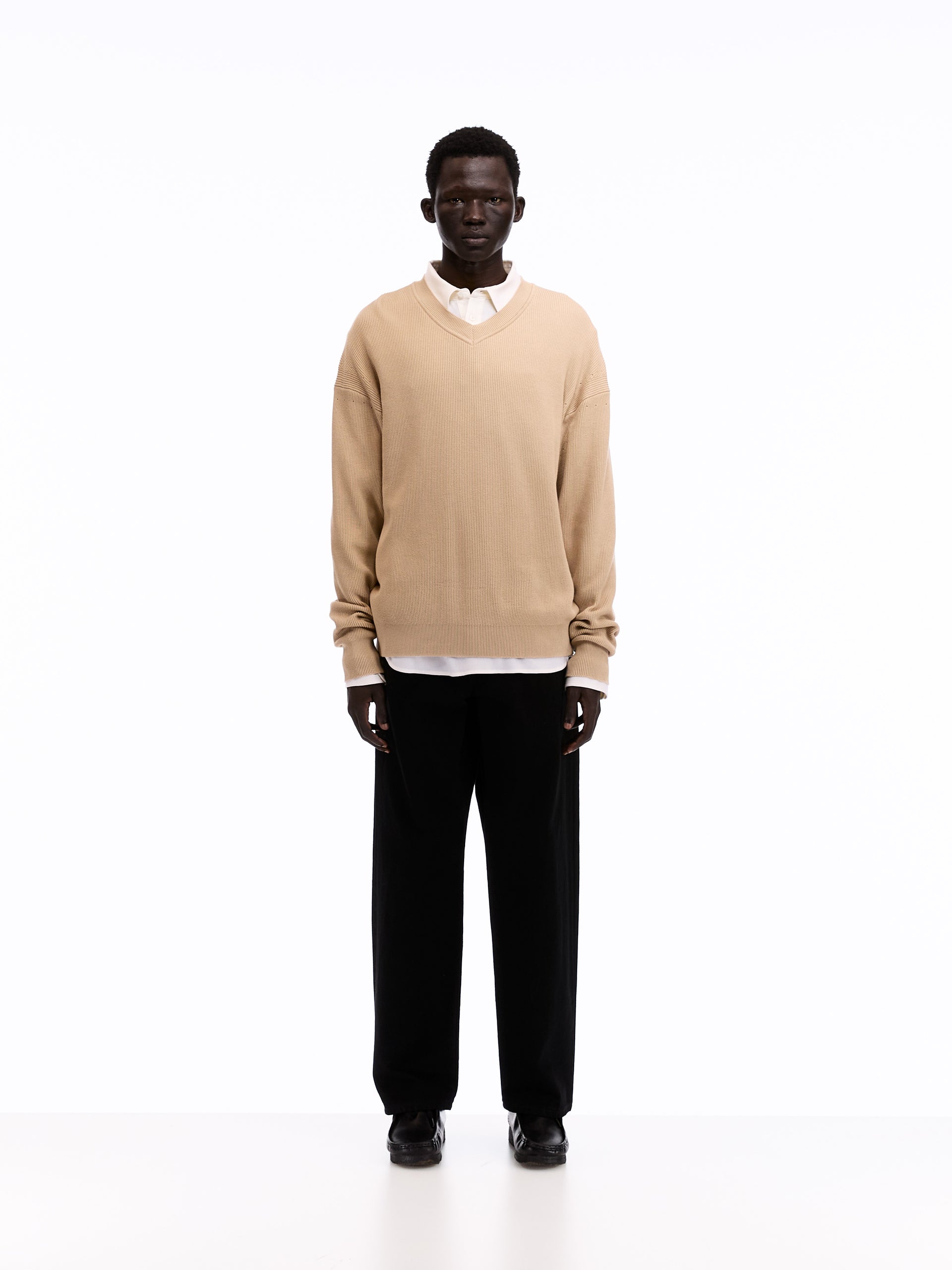 A V-neck knit sweater. Features a single rib knit and eyelet pattern design on sleeves and shoulders.