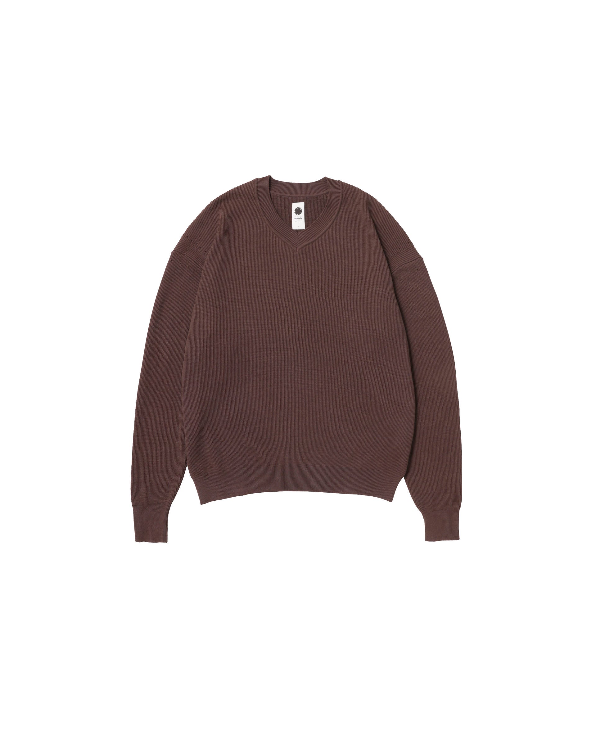 A V-neck knit sweater. Features a single rib knit and eyelet pattern design on sleeves and shoulders.