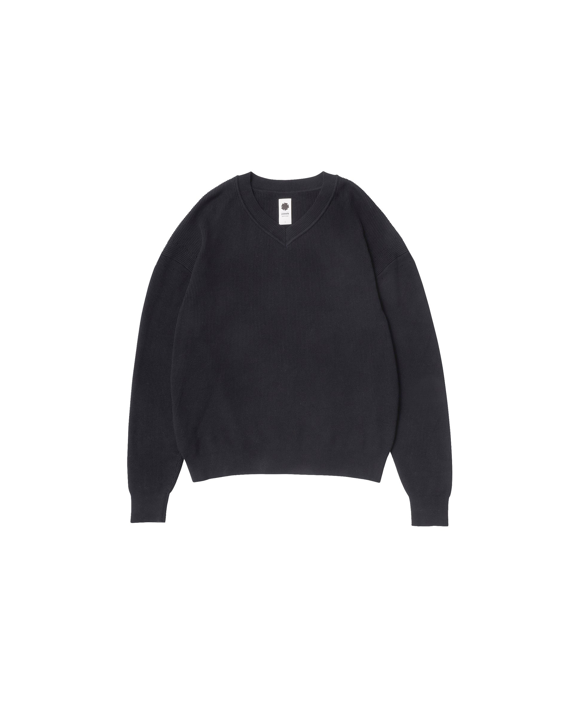 A V-neck knit sweater. Features a single rib knit and eyelet pattern design on sleeves and shoulders.