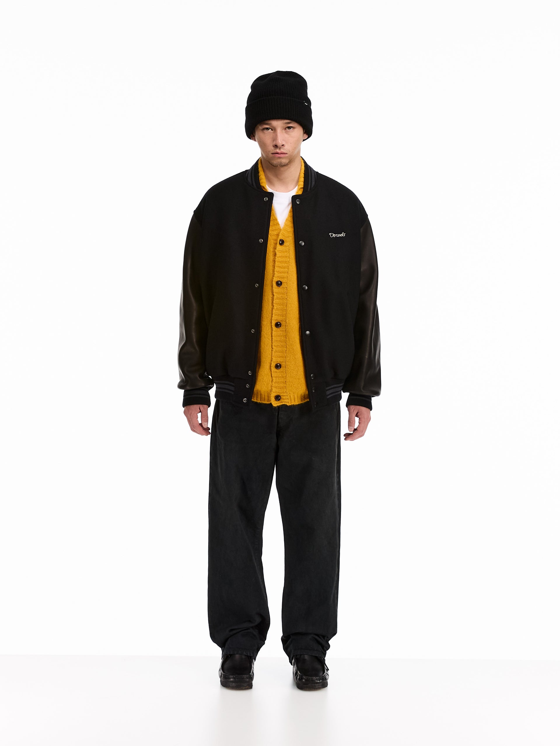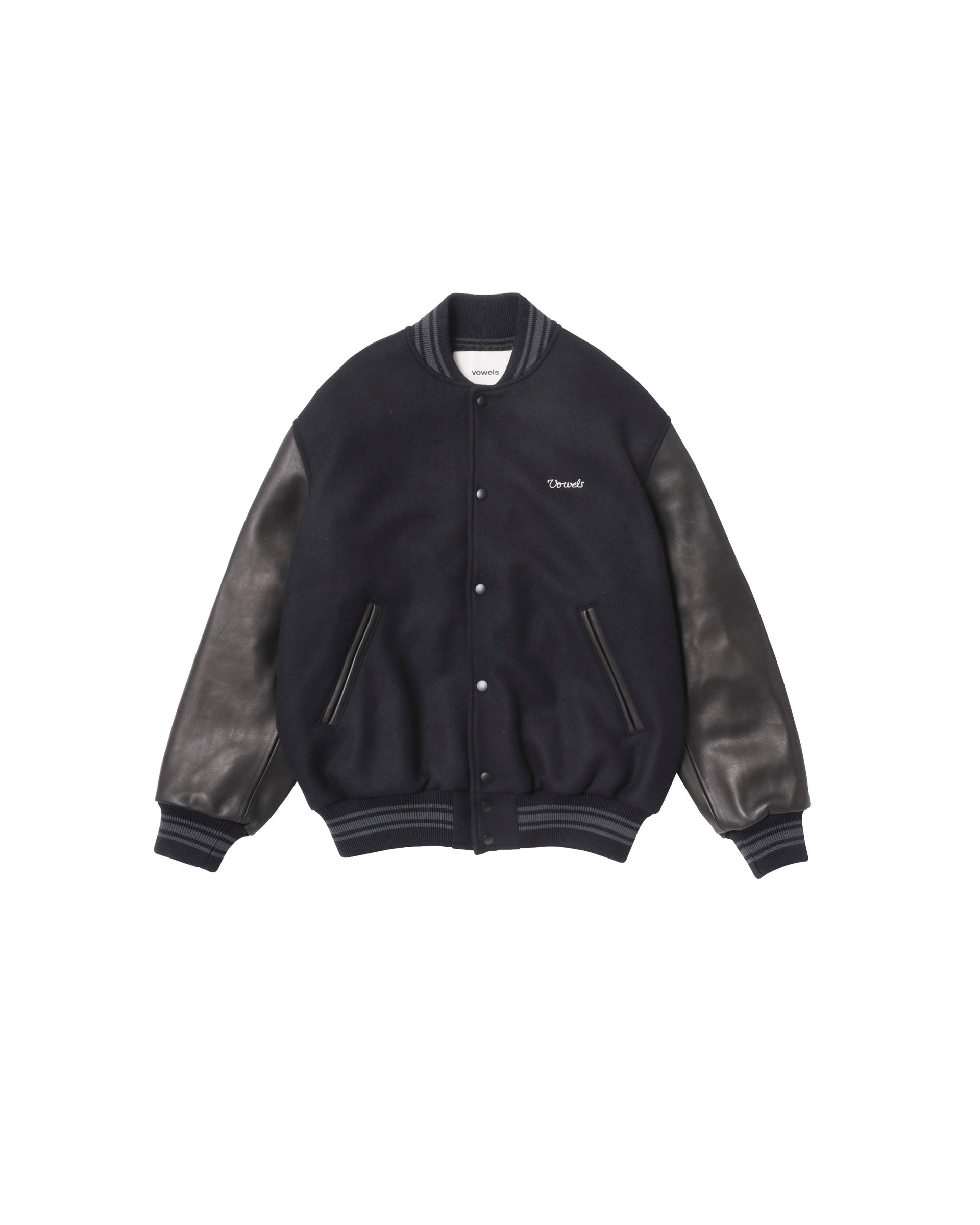 A minimalist stadium jacket made with premium melton fabric for the body and supple sheep leather for the sleeves.