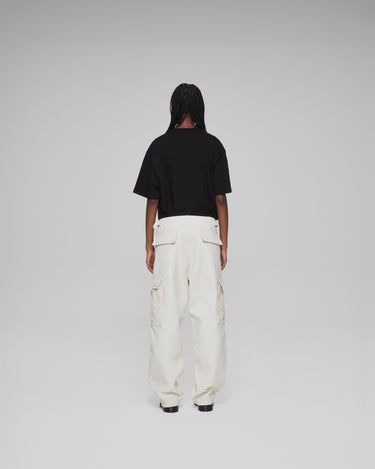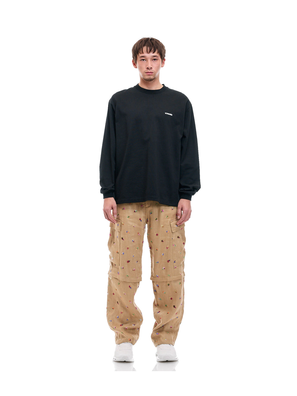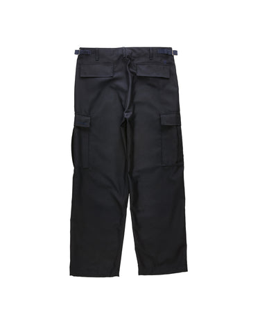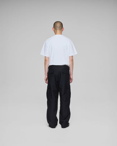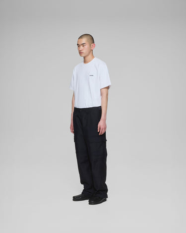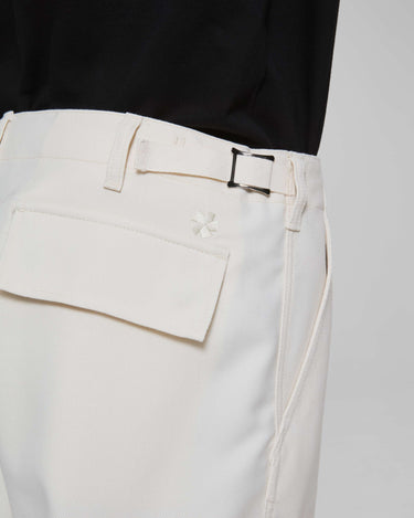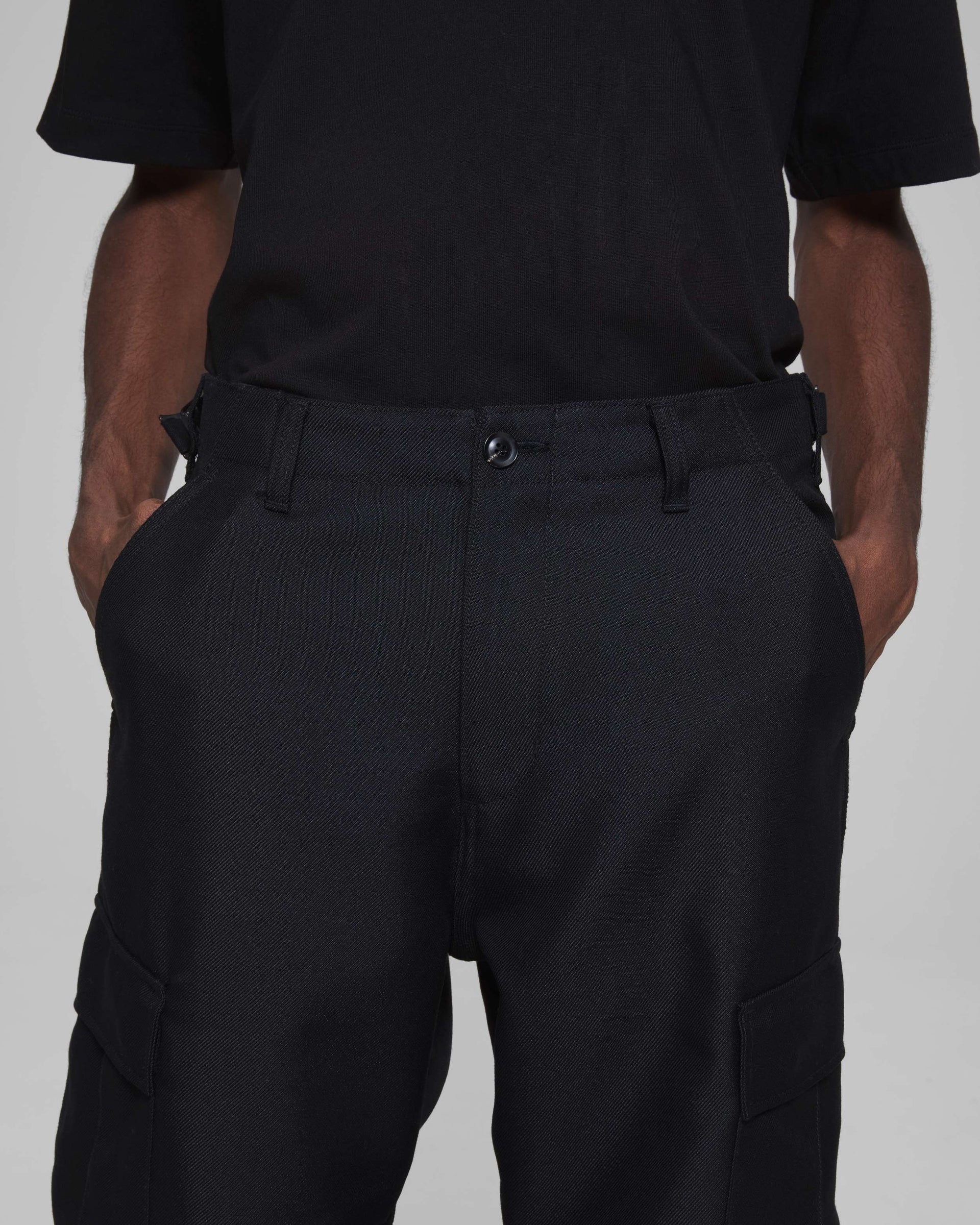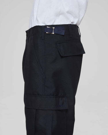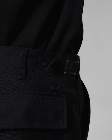Straight fit wool-polyester chambray pants. Featuring tape waist adjustment, slant pockets, thigh level cargo pockets with flap closure, and two flap closure rear pockets. vowels logo embroidered on left cargo pocket flap and right rear. Drawstring hem opening.
