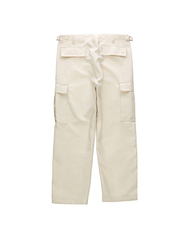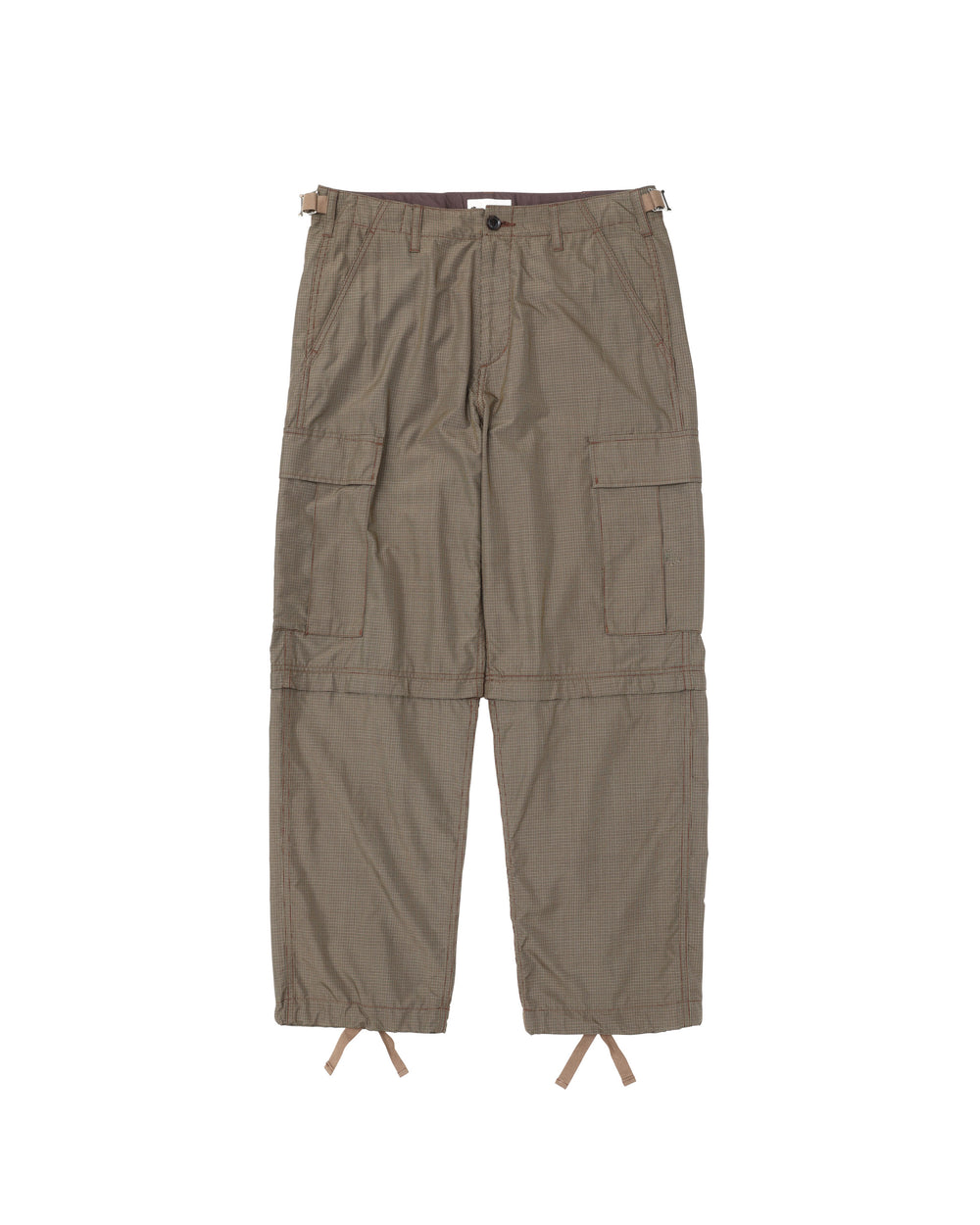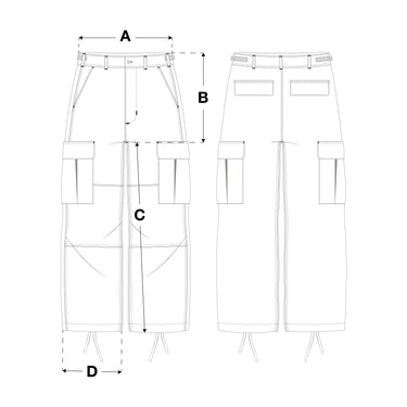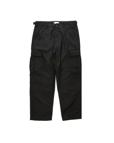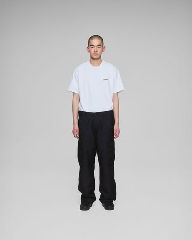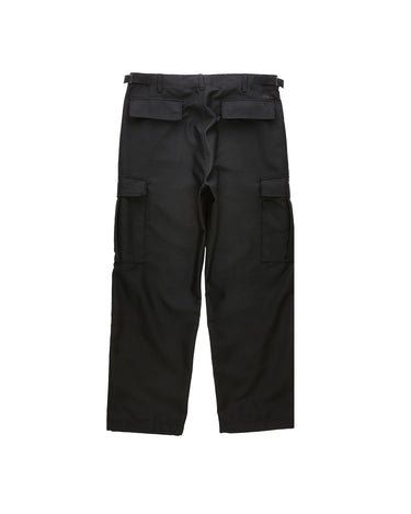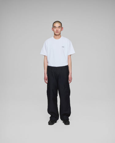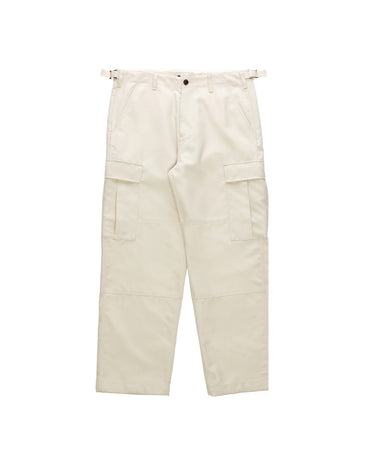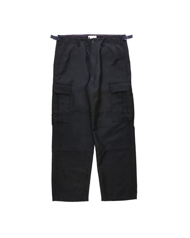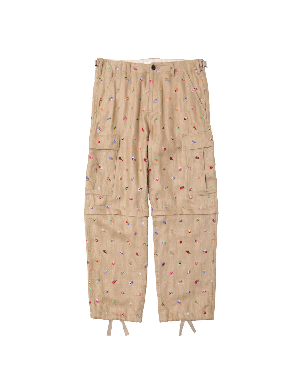Straight fit wool-polyester chambray pants. Featuring tape waist adjustment, slant pockets, thigh level cargo pockets with flap closure, and two flap closure rear pockets. vowels logo embroidered on left cargo pocket flap and right rear. Drawstring hem opening.
