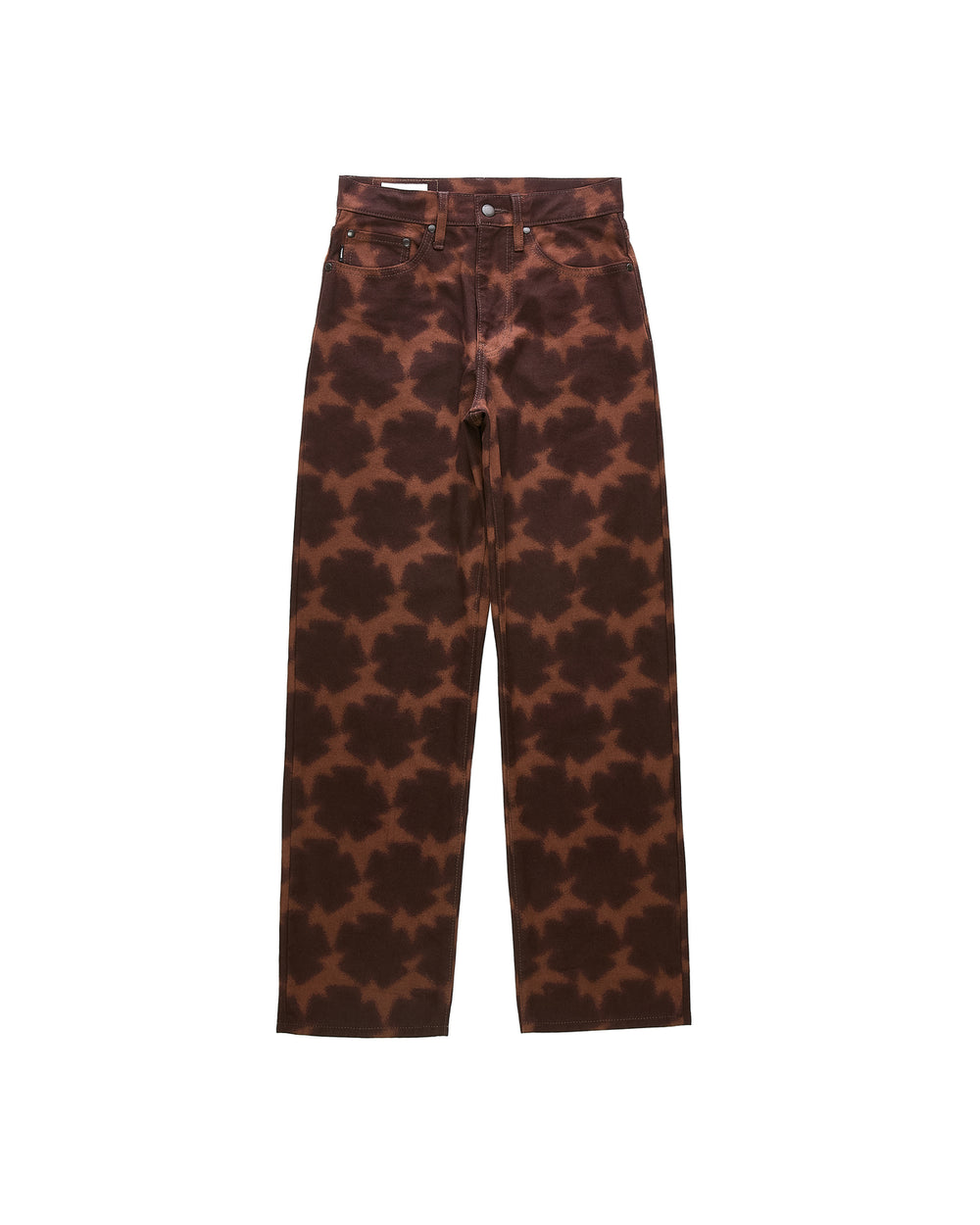 Relaxed straight fit five pocket chino work pant. Featuring slant pockets, coin pocket, with one button closure and one drop rear pockets, and embroidered vowels logo on rear right pocket. Reinforced along the hem and belt loops. Treated with cold mercerization process for a crisp glossy sheen.